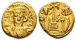 Constantine IV, with Heraclius and Tiberius. Solidus. IY 6 (677/8 AD). Carthage. (Doc-45). (Sear-1189). Anv.: D N TA OC (or similar), helmeted and cuirassed bust of Constantine facing, holding spear over right shoulder and shield on left arm. Rev.: Cross potent set on three steps, S (date) to right, at sides, Heraclius and Tiberius standing facing, each holding globus cruciger. Au. 4,31 g. Rare. Choice VF/Almost XF. Est...1000,00.