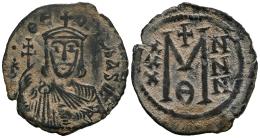 Theophilus. 40 Nummi. 829-842 AD. Constantinople. (Doc-13). (Sear-1666). Anv.: ΘЄOFIL bASIL', crowned bust facing, wearing chlamys, holding patriarchal cross and akakia; star in left field. Rev.: Large M, XXX and NNN to either side; cross above, Θ below. Ae. 6,81 g. Light wavy flan. VF. Est...60,00.