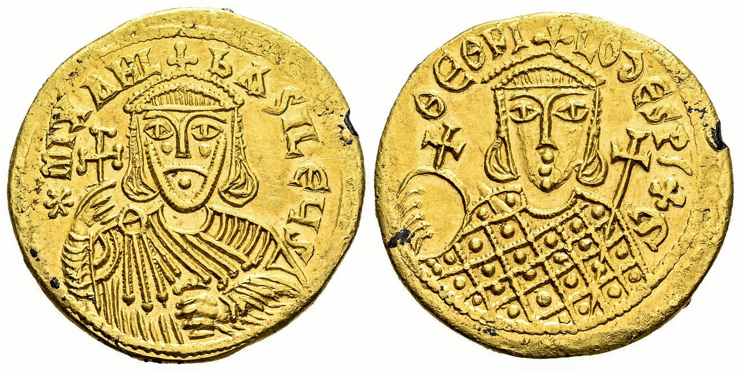 Michael II 'the Amorian', with Theophilus. Fourée Solidus. 821-829 AD. Constantinople. (Doc-5a var.). (Sear-1640 var.). Anv.: ✱MIXAHL bASILЄЧS, crowned bust of Michael facing, wearing chlamys and holding cross potent and akakia. Rev.: ΘЄOFILO ∂ЄSP'⧾Є, crowned bust of Theophilus facing, wearing loros and holding globus cruciger and cruciform sceptre. Ag/Au. 4,39 g. Almost XF. Est...250,00.