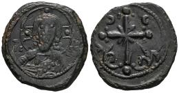 Anonymous. Time of Nicephorus III. Nummus. 1078-1081 AD. Constantinople. (Doc-Class I). (Sear-1889). Anv.: IC-XC, facing bust of Christ Pantokrator. Rev.: Latin cross with central X and globus and two pellets at the end of each extremity; crescents to upper left and right, floral scroll below. Ae. 8,07 g. Choice VF. Est...60,00.