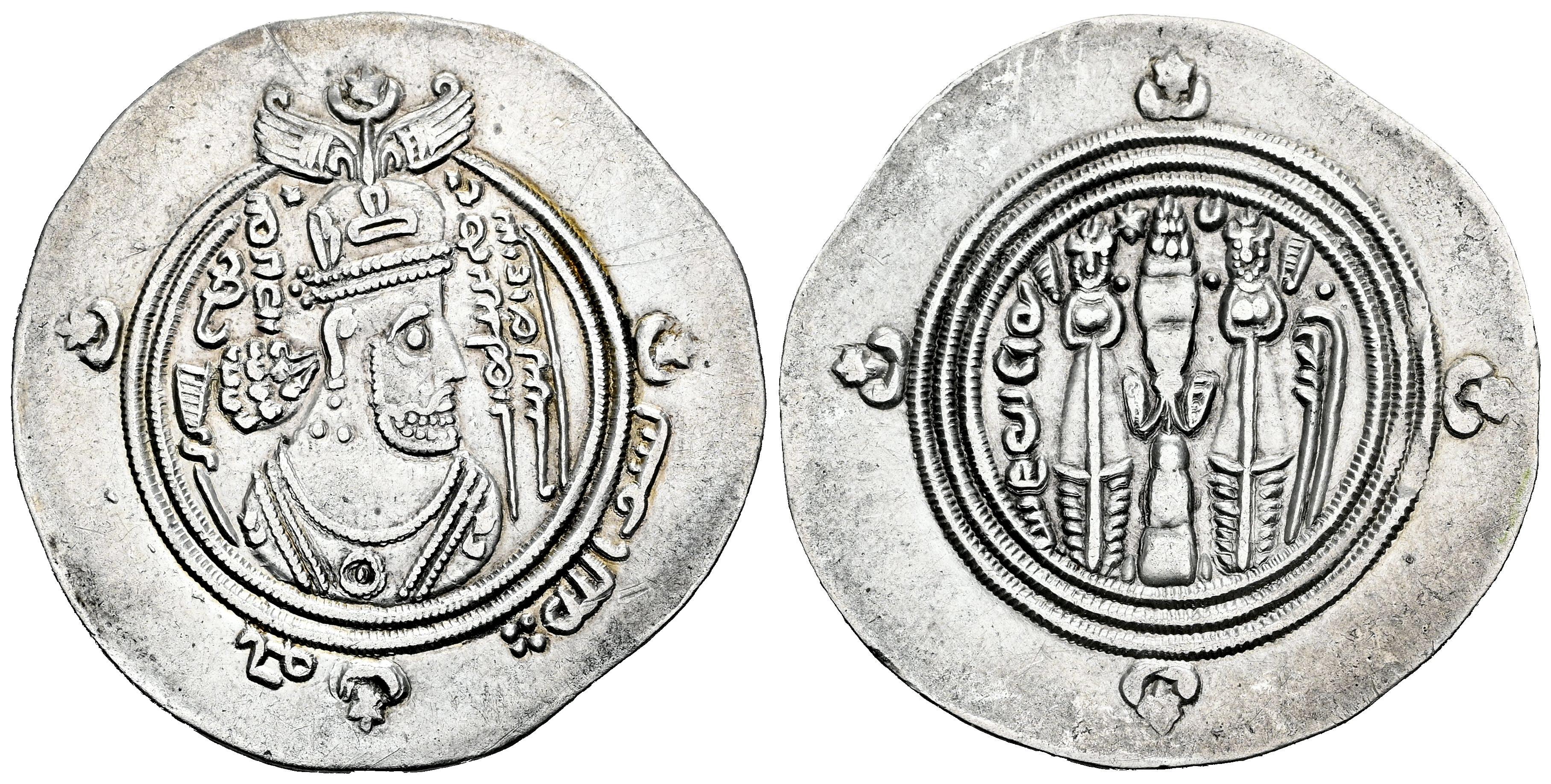 Umayyad Caliphate. 'Abd al-Malik ibn Marwan. Drachm. 75 H = 694/5 AD. BYS (Bishapur). (Album-31). (Walker-Arab-Sasanian, 221/3). (SICA-I 211). Anv.: Draped bust resembling Khosrau II to right, wearing an elaborate mural crown; behind head, ‘GDE / ʾp̄zwt'’ (‘[may his] glory increase’ in Pahlavi); before head, ‘mwhʾlp' Y / ʾbwcwplʾʾn’ (‘al-Muhallab son of Abu Sufra’ in Pahlavi); in the outer margin, ‘bism Allāh’ (‘In the name of Allah’ in Arabic). Rev.: Fire altar with ribbons, flanked by two attendants; above altar, star and crescent; to left, date in Pahlavi; to right, BYŠ (abbreviation for the name of the mint in Pahlavi). Ag. 3,95 g. Hairlines. Ex Classical Numismatic Group 395 (12/04/2017), lot 401. Included original label. Choice VF. Est...120,00.