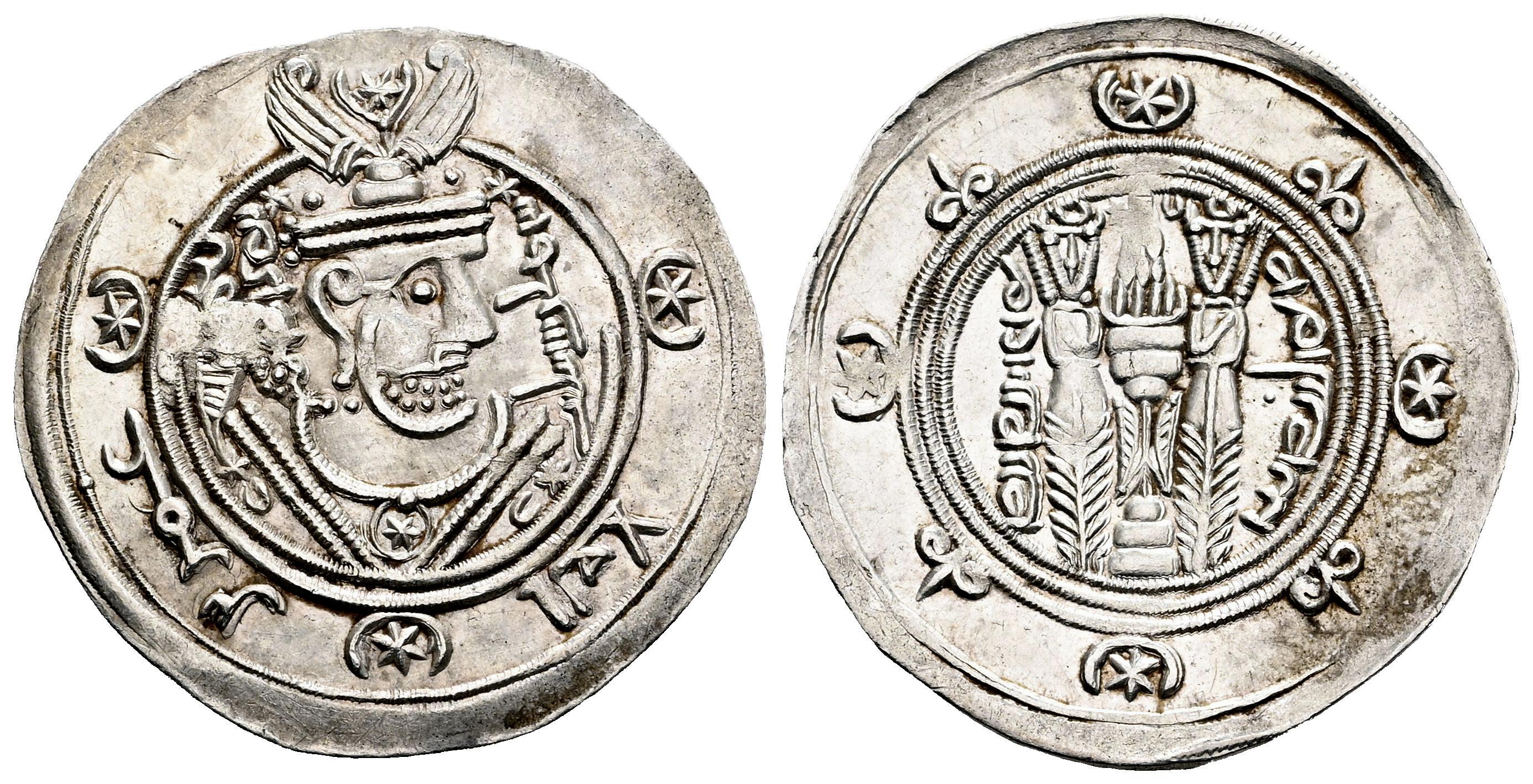 Abbasid Caliphate. Time of Al-Mahdi. Hemidrachm. PYE 125 = 160 AH. Tabaristán. (Album-57). (SICA-I 410). Anv.: Crowned Sasanian-style bust to right. Rev.: Fire altar flanked by attendants; star and crescent flanking flames. Ag. 2,01 g. A good sample. Ex Pars Coins, Vcoins (19/05/2017). XF. Est...150,00.