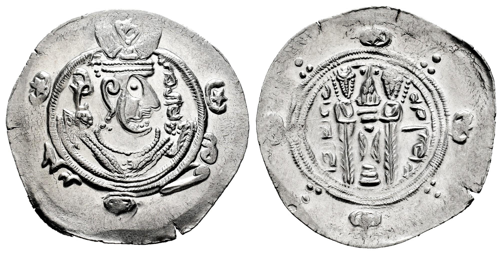 Abbasid Caliphate. Sulayman bin Musa'. Hemidrachm. PYE 135 = 170 AH. Tabaristán. (Album-64). Anv.: Sassanid-style draped bust on the right, with an elaborate crown; behind and in front of the head, 'GDE - ʾp̄zwt' ('[may his glory] increase' in Pahlavi); on the outer left margin, 'Jarīr' ('Jarir' in Arabic); on the outer right margin, 'ʾp̄d' ('wonderful' in Pahlavi). Rev.: Altar of Fire, flanked by two attendants; on the altar, two stars; on the left date in Pahlavi; to the right, 'tpwlstʾn' ('Tabaristan' in Pahlavi). Ag. 2,00 g. Original luster. Rare. XF. Est...90,00.