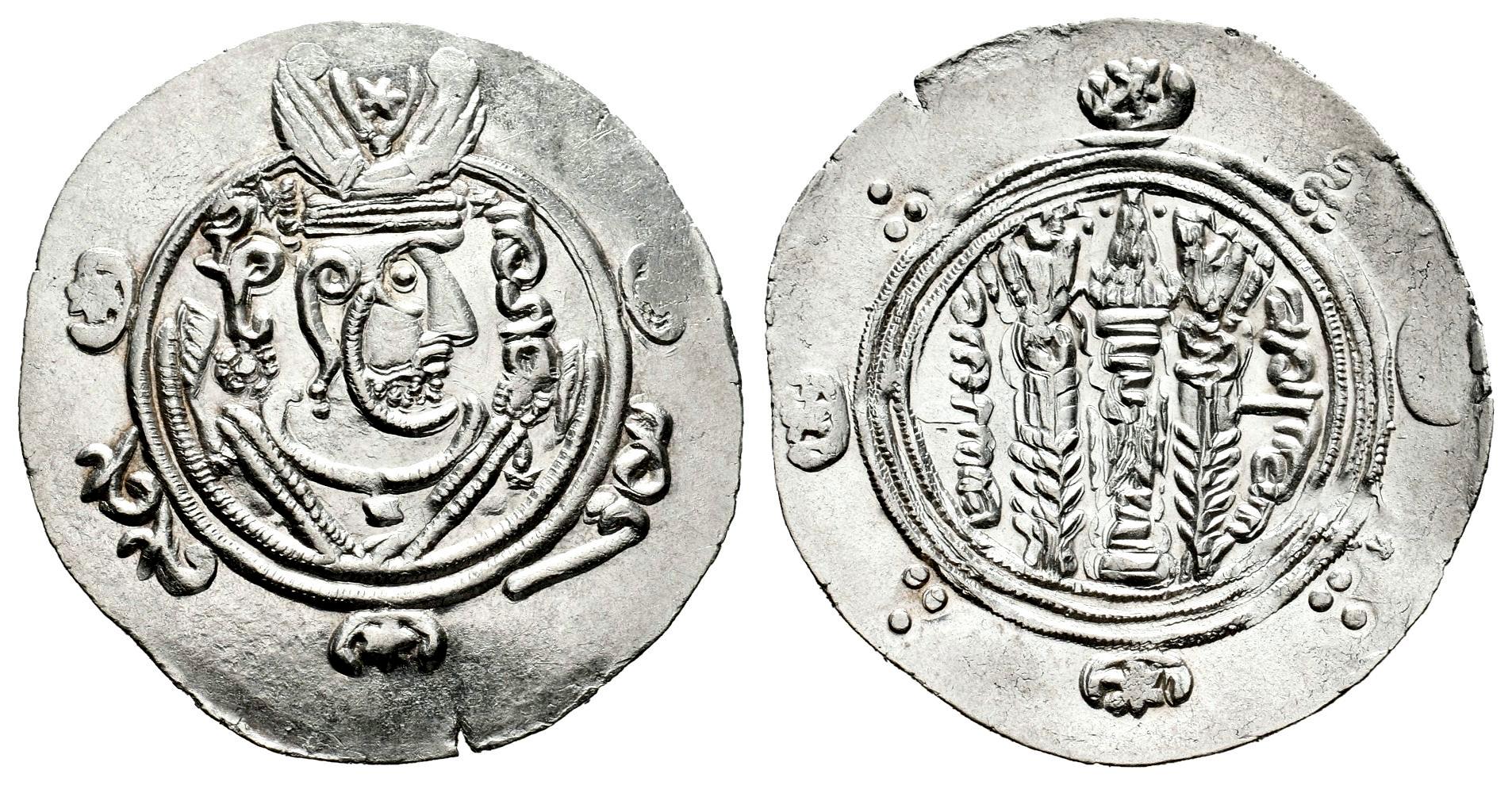 Abbasid Caliphate. Anonymous. Hemidrachm. PYE 134 = 269 AH. Tabaristán. (Album-73). (Walker-Arab-Sassanian, p.156, 10). Anv.: Crowned and draped Sasanian-style bust to right; behind head, GDH ('kingship' in Pahlawi); before head, 'AFZUT' ('may increase' in Pahlawi); in outer margin, APD / NWKW ('excellent' and 'good' in Pahlawi) and 'bakh bakh' ('very fine' in Arabic). Rev.: Sasanian fire altar set on three steps, flanked by two attending priests (mabedh) standing facing; to left, date; to right, mint TPURSTAN ('Tabaristan' in Pahlawi). Ag. 2,00 g. A good sample. Original luster. Very rare. AU/Almost MS. Est...100,00.
