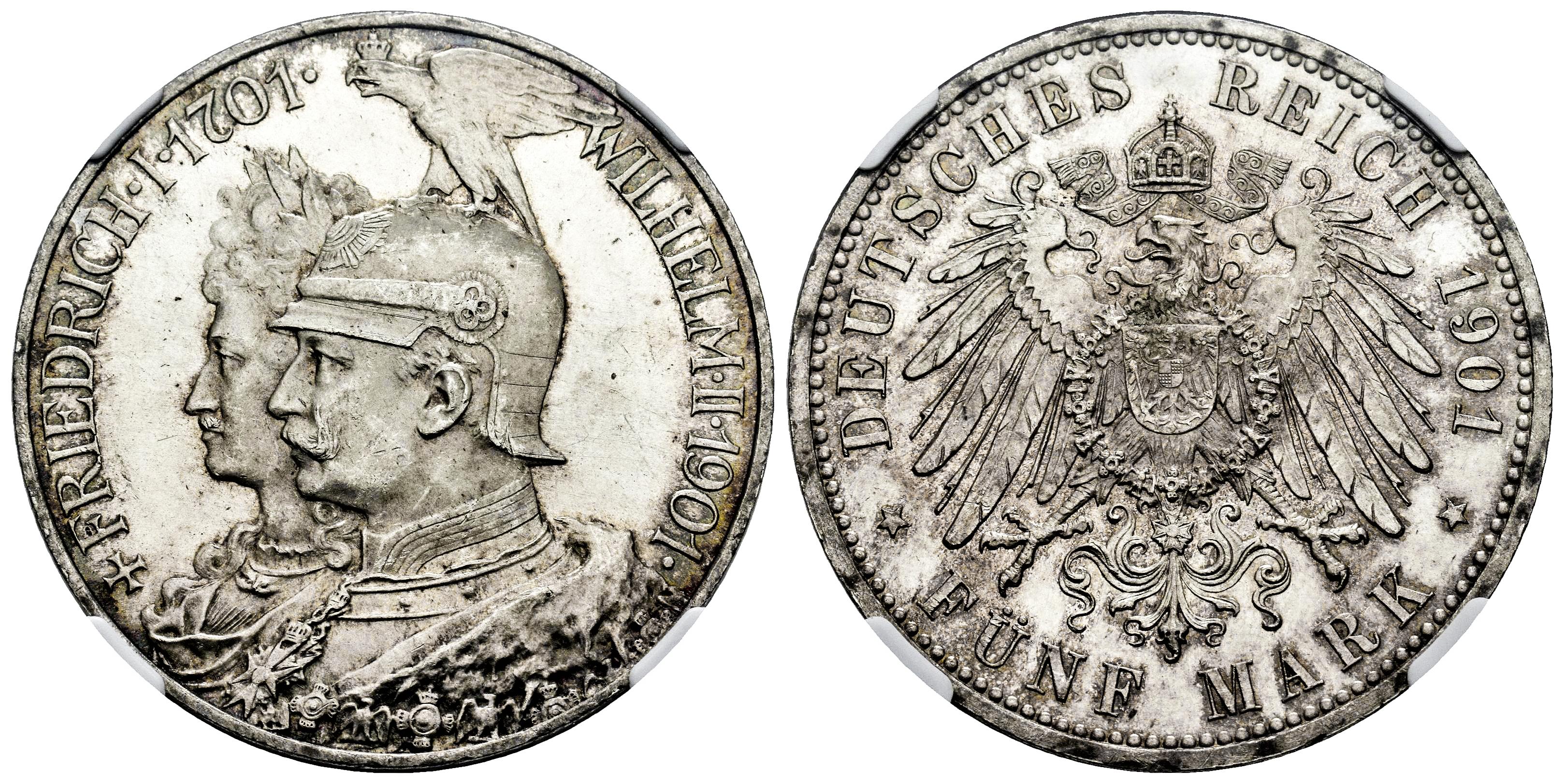 Germany. Prussia. Wilhelm II (1888-1918). 5 mark. 1901. Berlin. A. (Km-526). (AKS-135). (Jaeger-106). Ag. Full luster and slight tone. Slabbed by NGC as MS 64. Est...300,00.