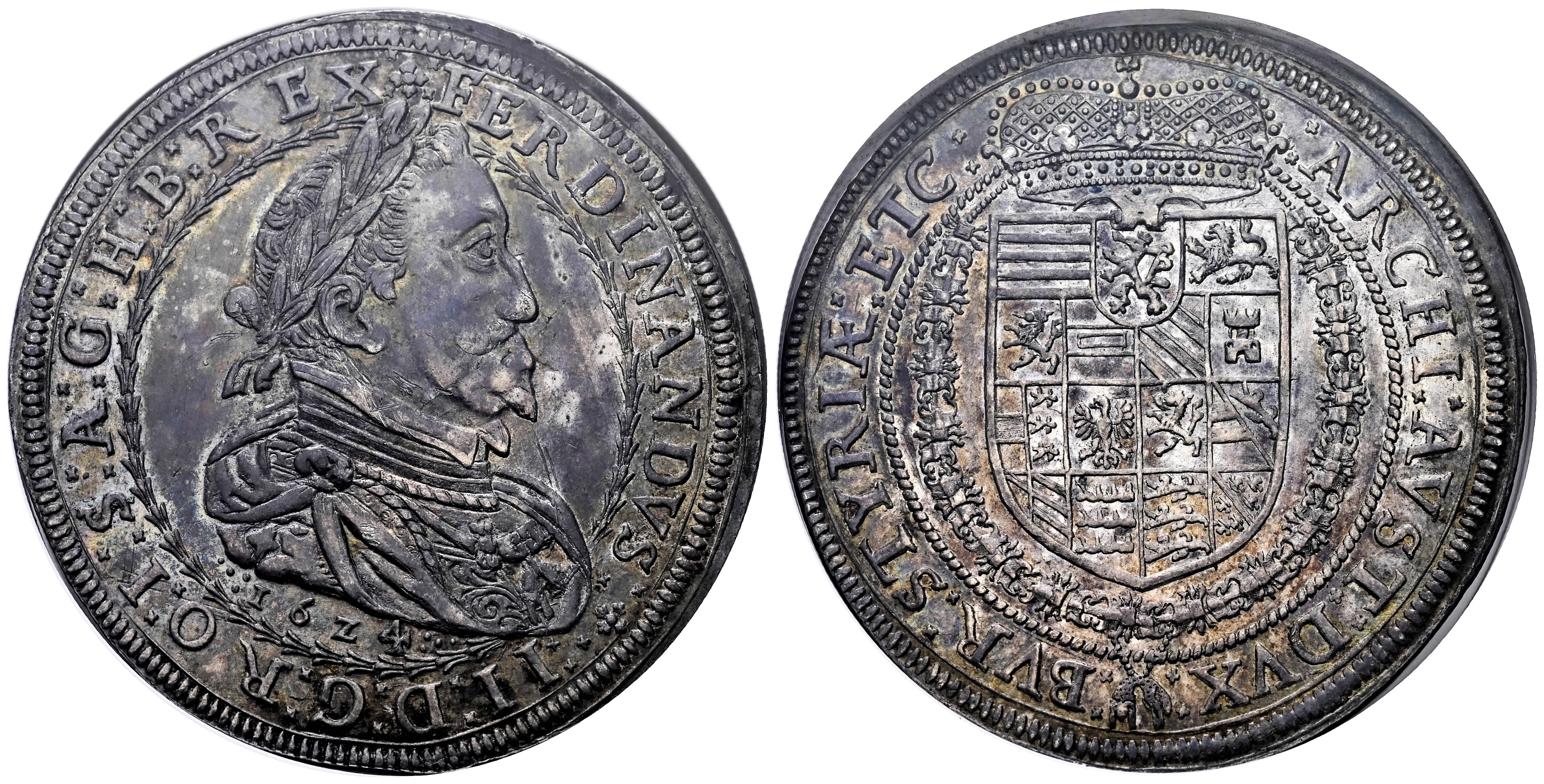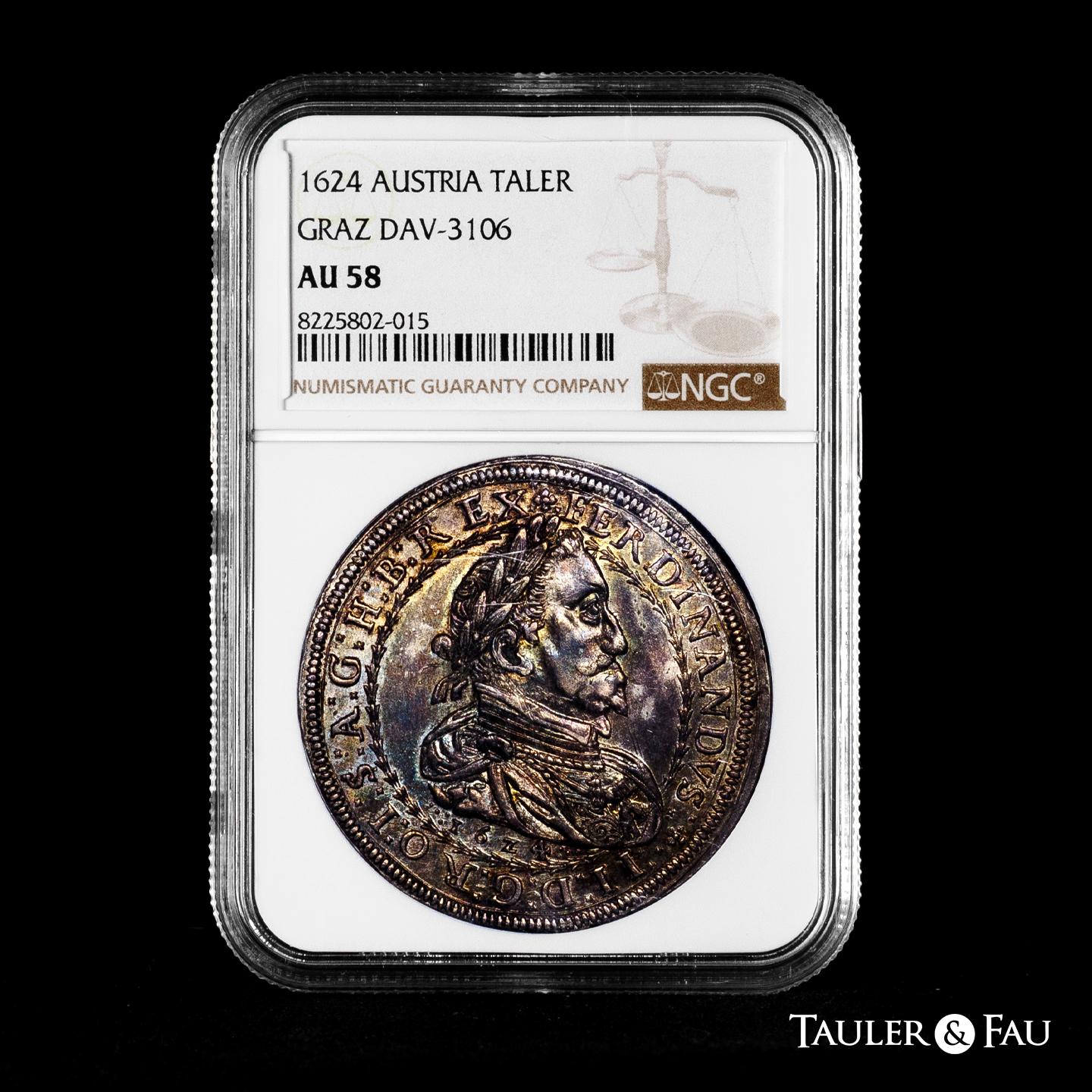 Austria. Ferdinand II (1619-1637). Taler. 1624. Graz. (Km-446). (Dav-3106). Ag. Nice cabinet tone with light iridescent hues and underlying luster. Bold struck, with all details clearly defined. Rare in this condition. Slabbed by NGC as AU 58. Only 2 finer specimens in the NGC census. Est...900,00.