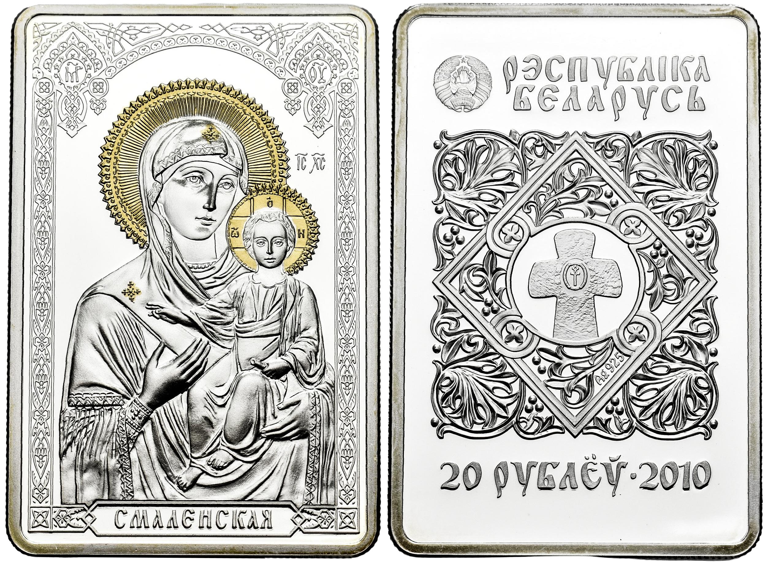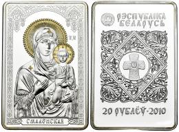 Belarus. 20 roubles. 2010. (Km). Ag. 31,10 g. 0.925. 30x45 mm. Icon of the Most Holy Theotokos of Minsk. Housed in case and accompanied by certificate of authenticity. PROOF. Est...80,00.