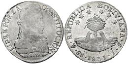 Bolivia. 8 soles. 1831. Potosi. JF. (Km-97). Ag. 26,93 g. Weak strike. Original luster. Choice VF/XF. Est...180,00.
