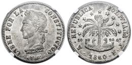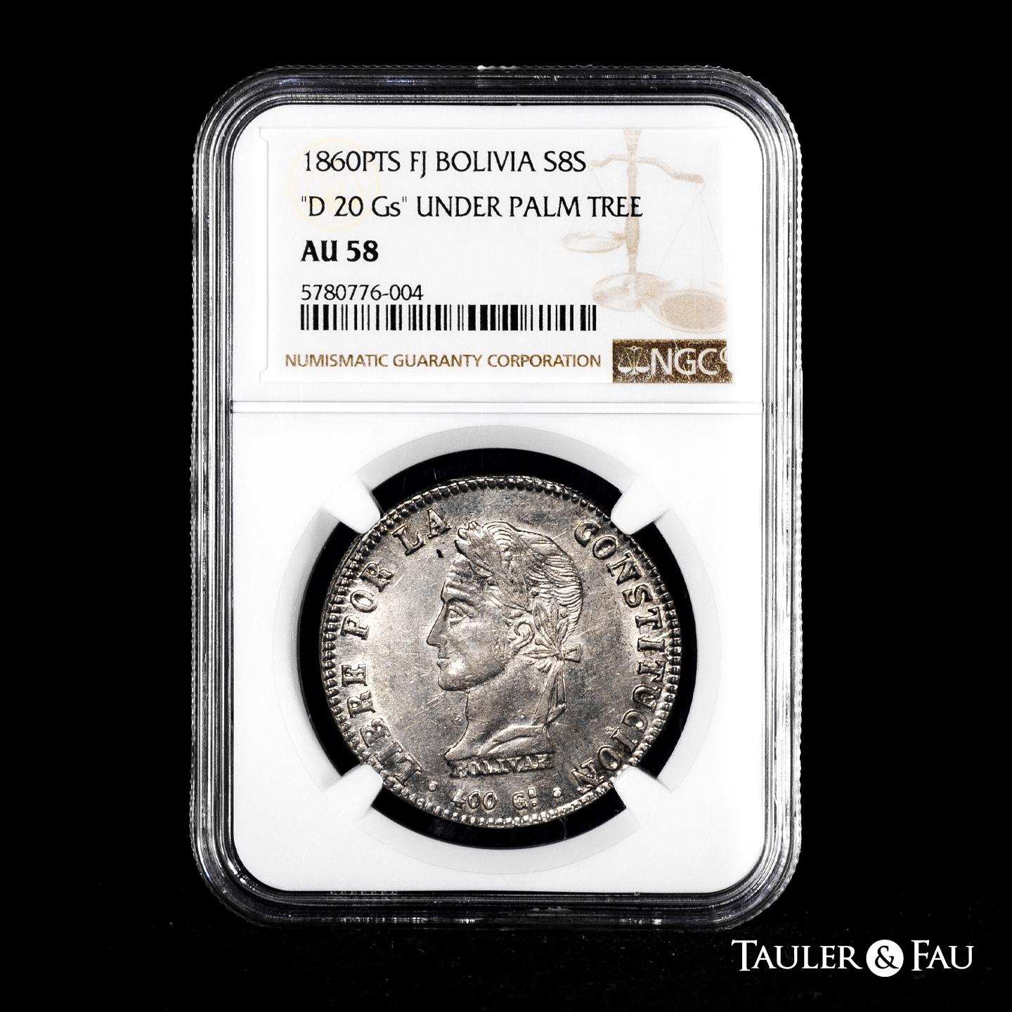 Bolivia. 8 soles. 1860. Potosi. FJ. (Km-138). Ag. "D 20 Gs" under palm tree. Soft tone and luster. Slabbed by NGC as AU 58. Only 2 finer specimens in the NGC census. Est...400,00.