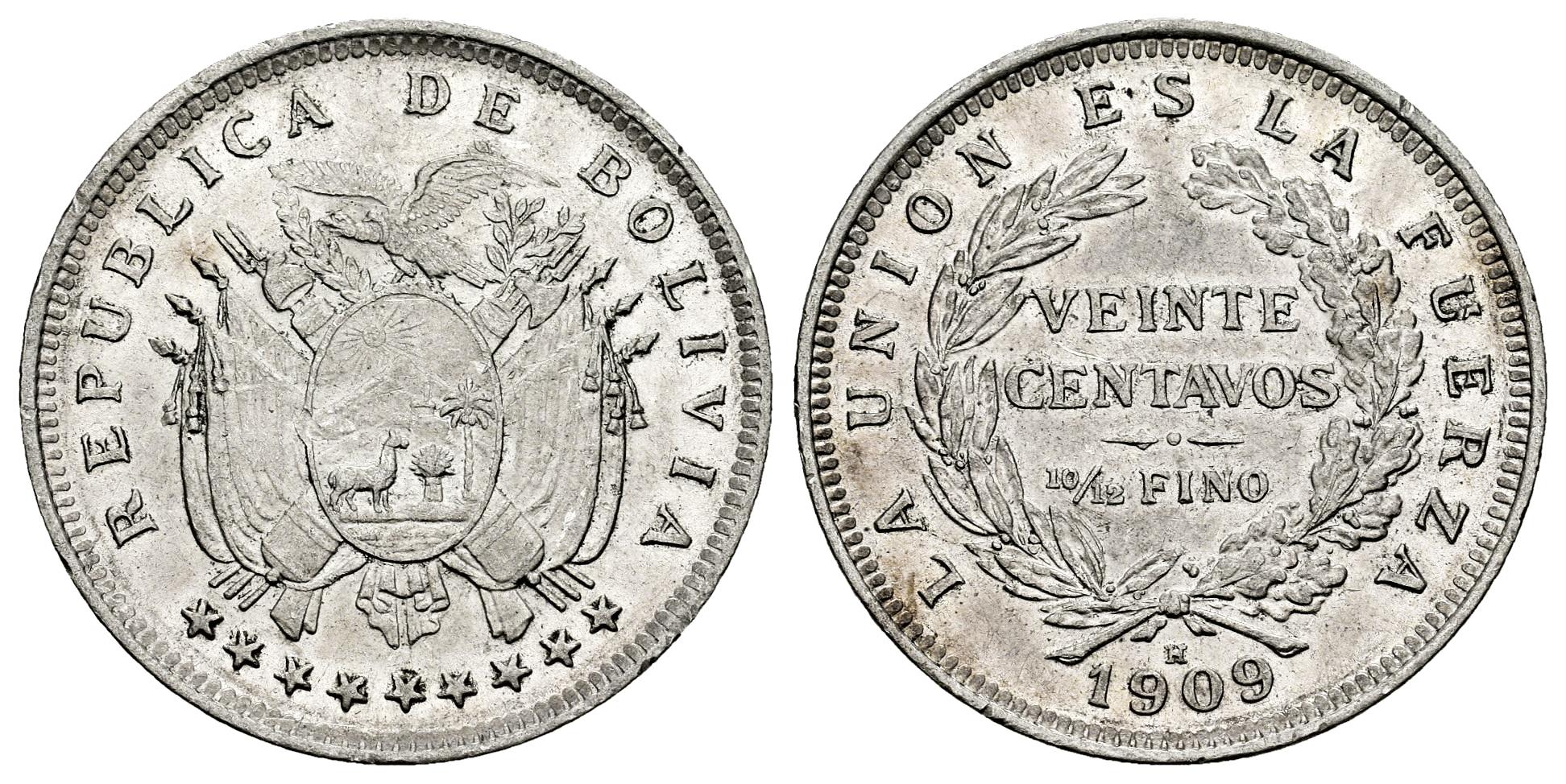 Bolivia. 50 centavos. 1909. Heaton. H. (Km-1176). Ag. 4,00 g. Minor nick on edge. Original luster. Almost MS. Est...30,00.