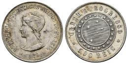 Brazil. 500 reis. 1889. (Km-494). Ag. 6,41 g. Traces of luster. XF/AU. Est...30,00.