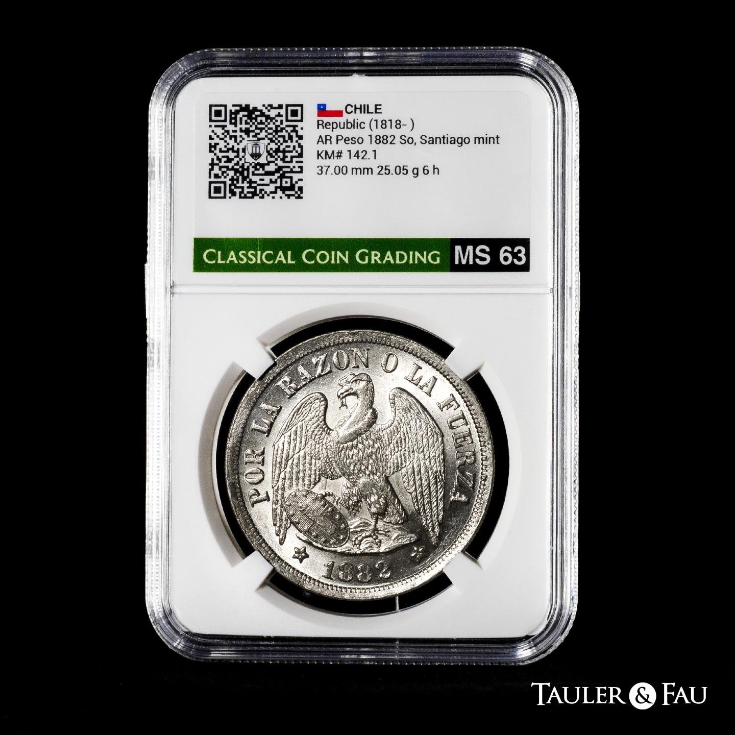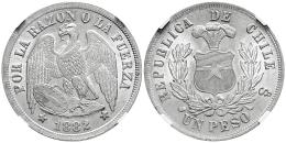 Chile. 1 peso. 1882. Santiago. (Km-142.1). Ag. 25,05 g. Original luster. Slabbed. Mint state. Est...180,00.