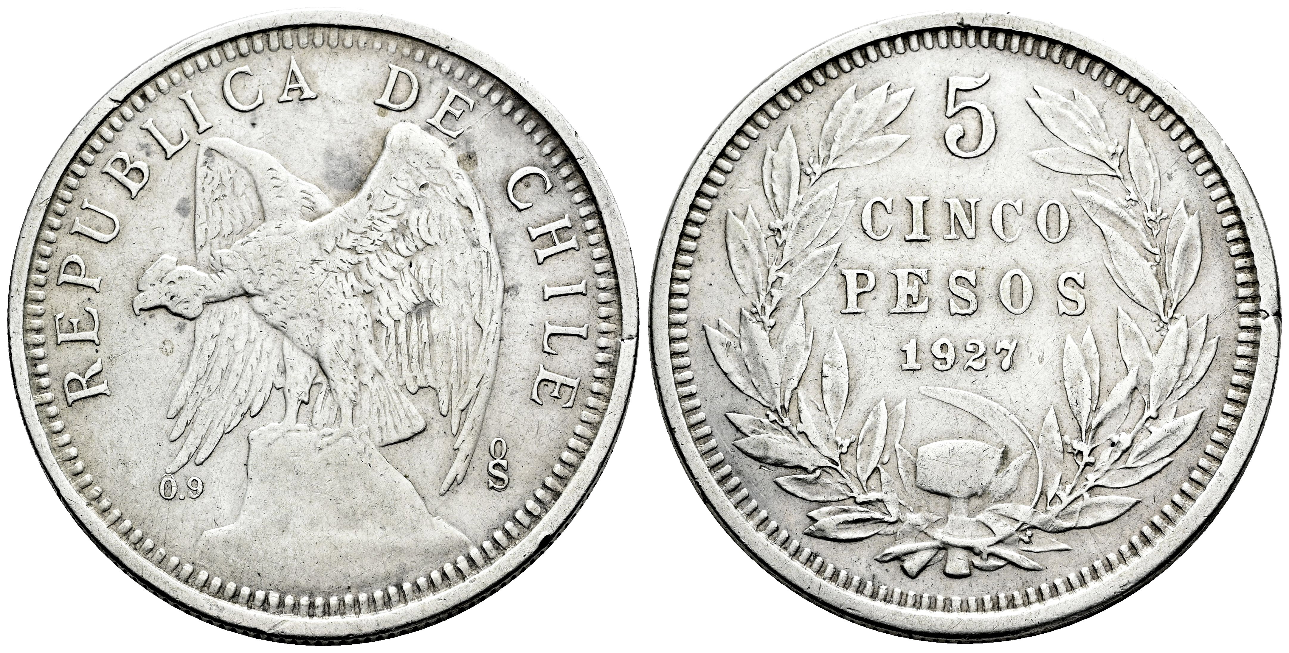 Chile. 5 pesos. 1927. Santiago. (Km-173.1). Ag. 24,77 g. VF/Choice VF. Est...55,00.