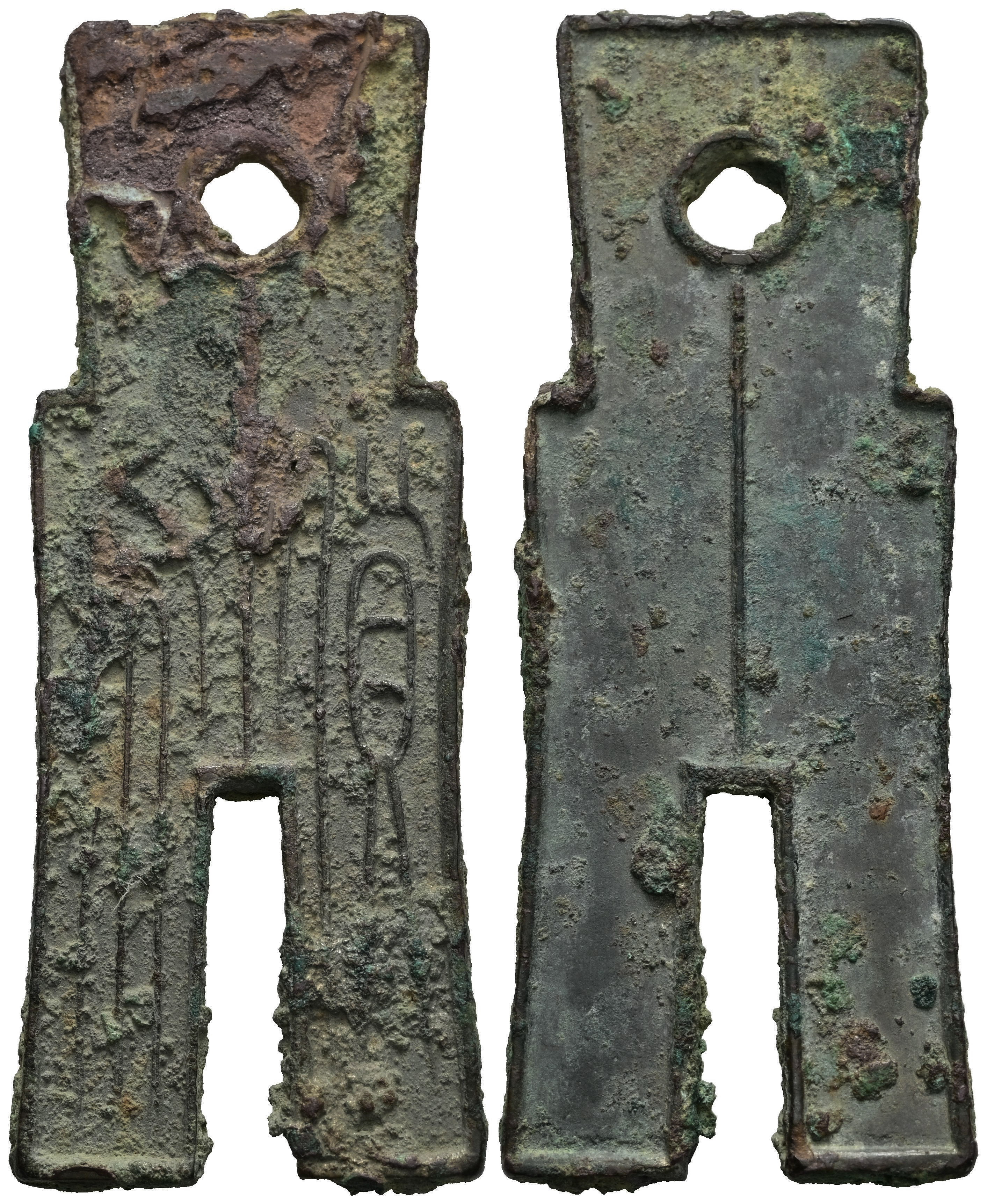 China. Xīn dynasty. Huo Bu (Money Spade). 14-23 AD. Wáng Măng. (Hartill-9.30). (Bn-Chinoises II 445/50). Anv.: Huo Bu in archaizing zhuànshū Hànzì (seal script) characters. Ae. 15,41 g. 58 mm x 23 mm. Rust. VF. Est...50,00.