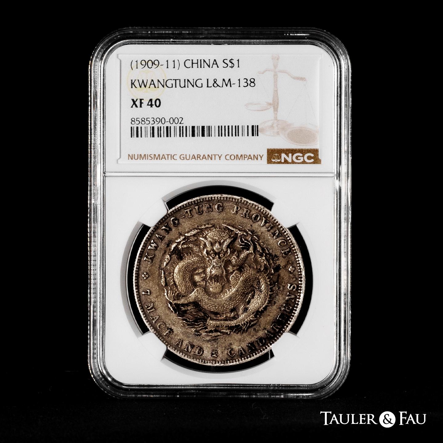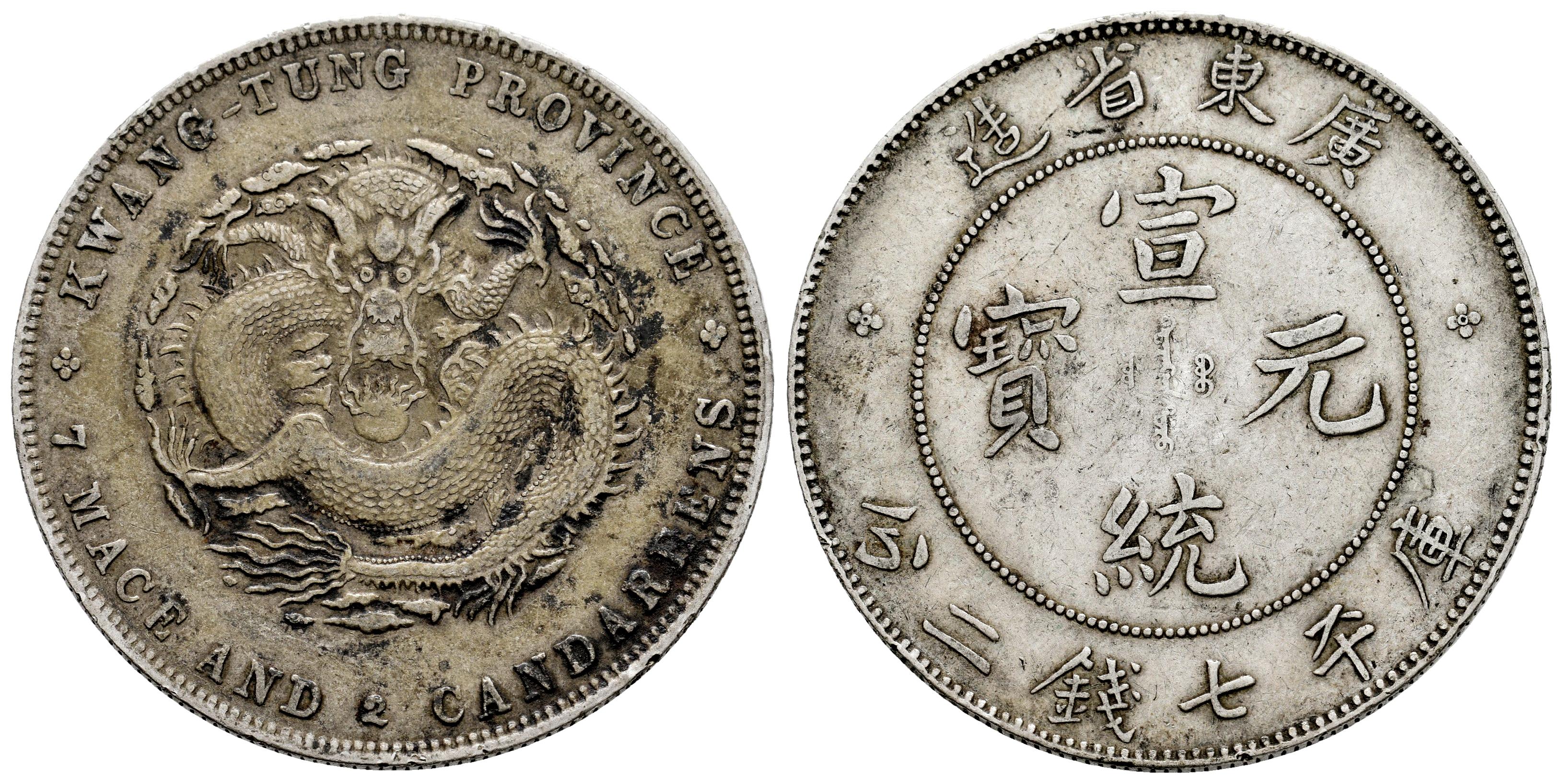 China. Xuantong (1908-1912). 1 dollar - 7 mace 2 candareens. ND (1909-1911). Kwang-Tung. (Km-Y206). (L&M-138). Ag. Slight patina. Slabbed by NGC as XF 40. NGC-XF. Est...500,00.
