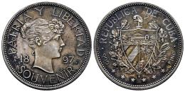 Cuba. 1 peso souvenir. 1897. (Km-XM2). Ag. 22,52 g. Type II (star below baseline of 97). NIce old cabinet tone. AU. Est...400,00.