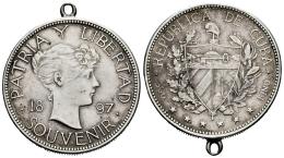 Cuba. 1 peso souvenir. 1897. (Km-XM2). Ag. 22,14 g. Type II. Star below 97 baseline, close date variety. Scratches on obverse. Used as a jewelry piece. VF/Choice VF. Est...120,00.