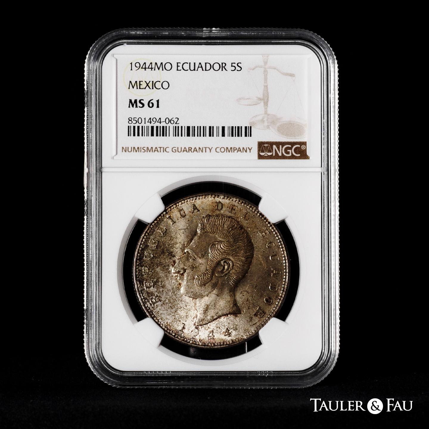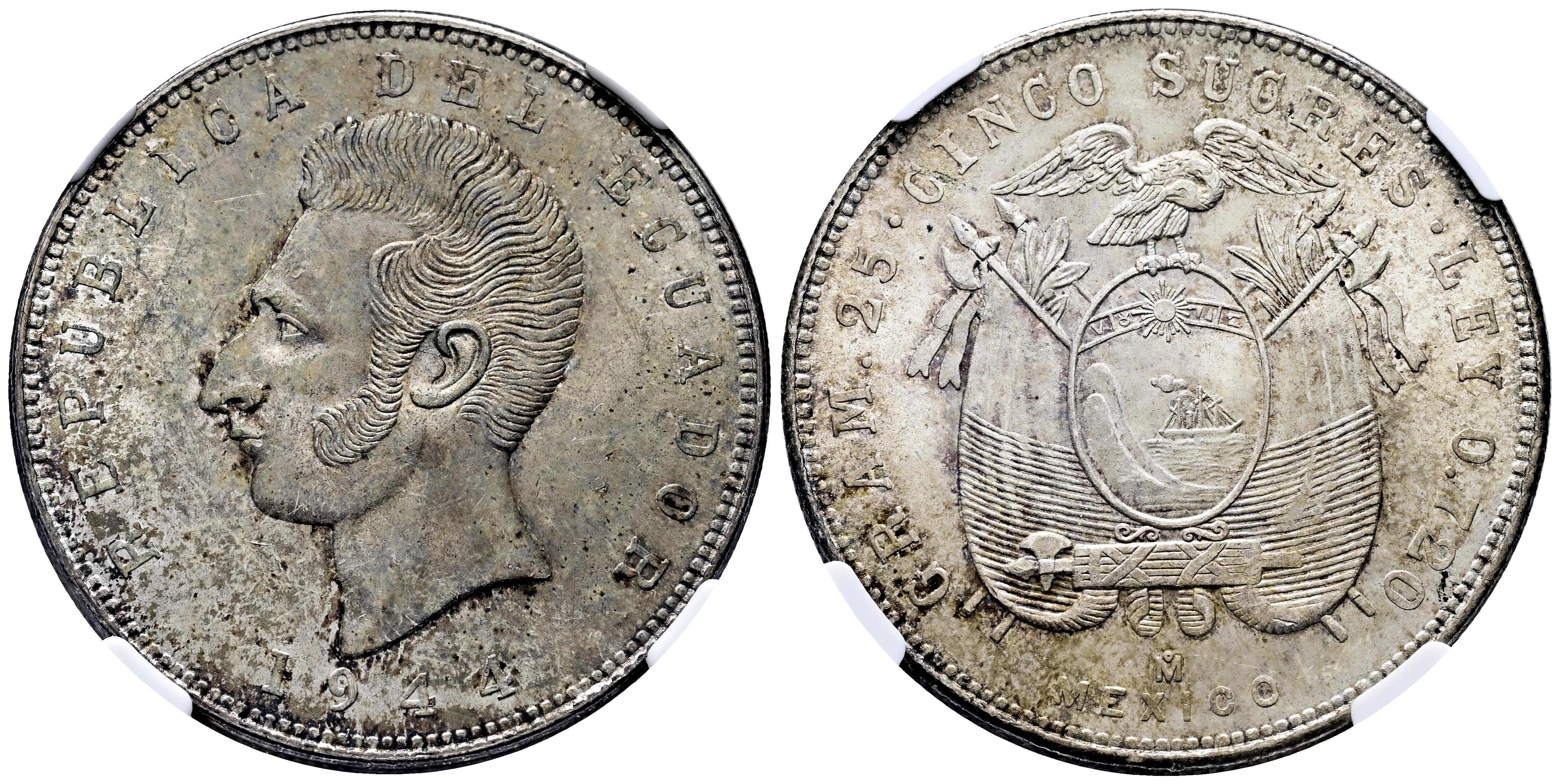 Ecuador. 5 sucres. 1944. Mexico. (Km-79). Ag. Faint scratches. Beautiful patina. Traces of luster. Slabbed by NGC as MS 61. Est...60,00.