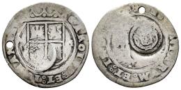 El Salvador. (Km-46). Ag. 2,81 g. Countermark of the Arms of El Salvador issued in 1868 on a 1 Real coin struck in Mexico M-G during the reign of Joanna & Charles. Rare on this coin. Very few specimens known. Choice F. Est...200,00.