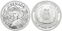 East Caribean States. 2 dollars. 2023. Grenada. (Km-29). Ag. 31,23 g. PROOF. Est...70,00.