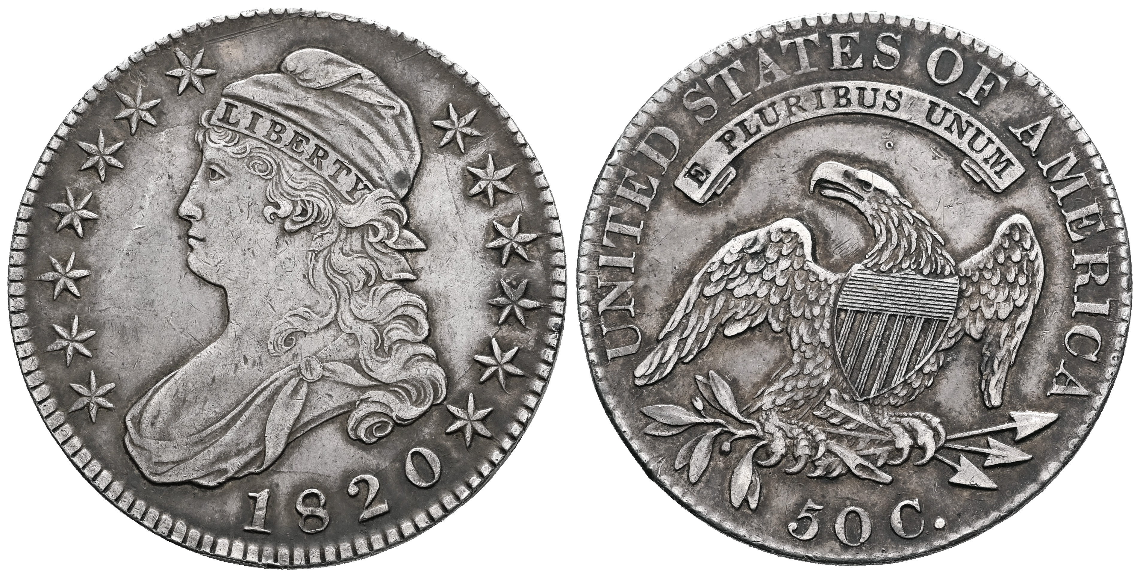 U.S. Coins. Capped Bust. Half dollar. 1820. Philadelphia. (Km-37). Ag. 13,45 g. Minor nick on edge. Patina. Scarce. Choice VF. Est...250,00.