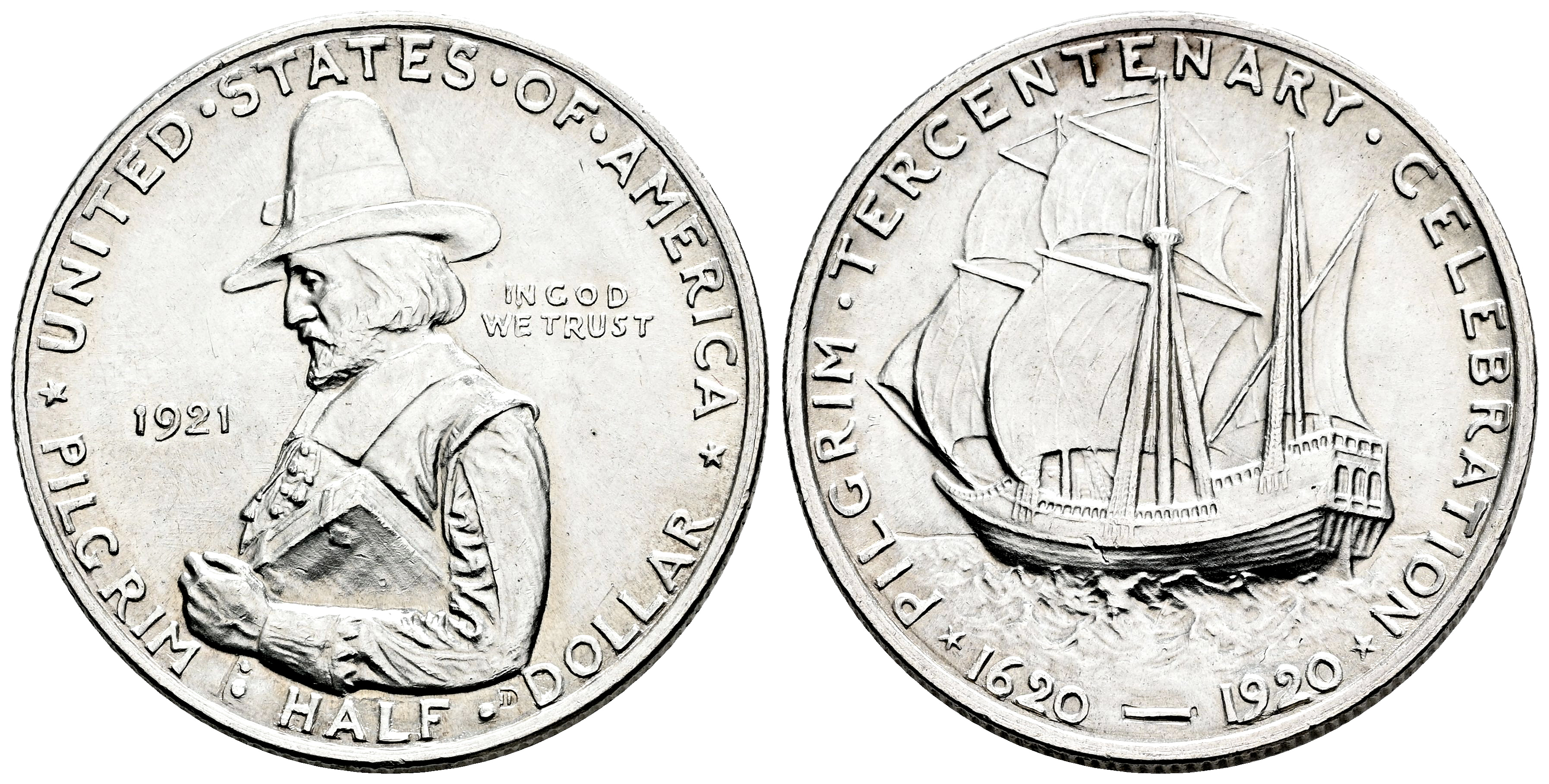 U.S. Coins. Half Dollars. Half dollar. 1920. Philadelphia. (Km-147.1). Ag. 12,51 g. Commemorating the 300th Anniversary of the Landing of Pilgrims at Plymouth, Massachusetts. Original luster. Mint state. Est...90,00.