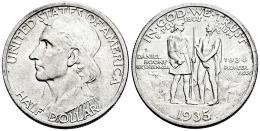 U.S. Coins. Half Dollars. Half dollar. 1935/34. Philadelphia. (Km-165.2). Ag. 12,46 g. Daniel Boone Bicentennial. After the initial success of the 1934 Boone half dollar, the commemorative celebration continued (after Congressional legislation) by placing 1934 above PIONEER YEAR on the reverse, and 10,000 coins were struck in the Philadelphia mint. Almost MS. Est...100,00.