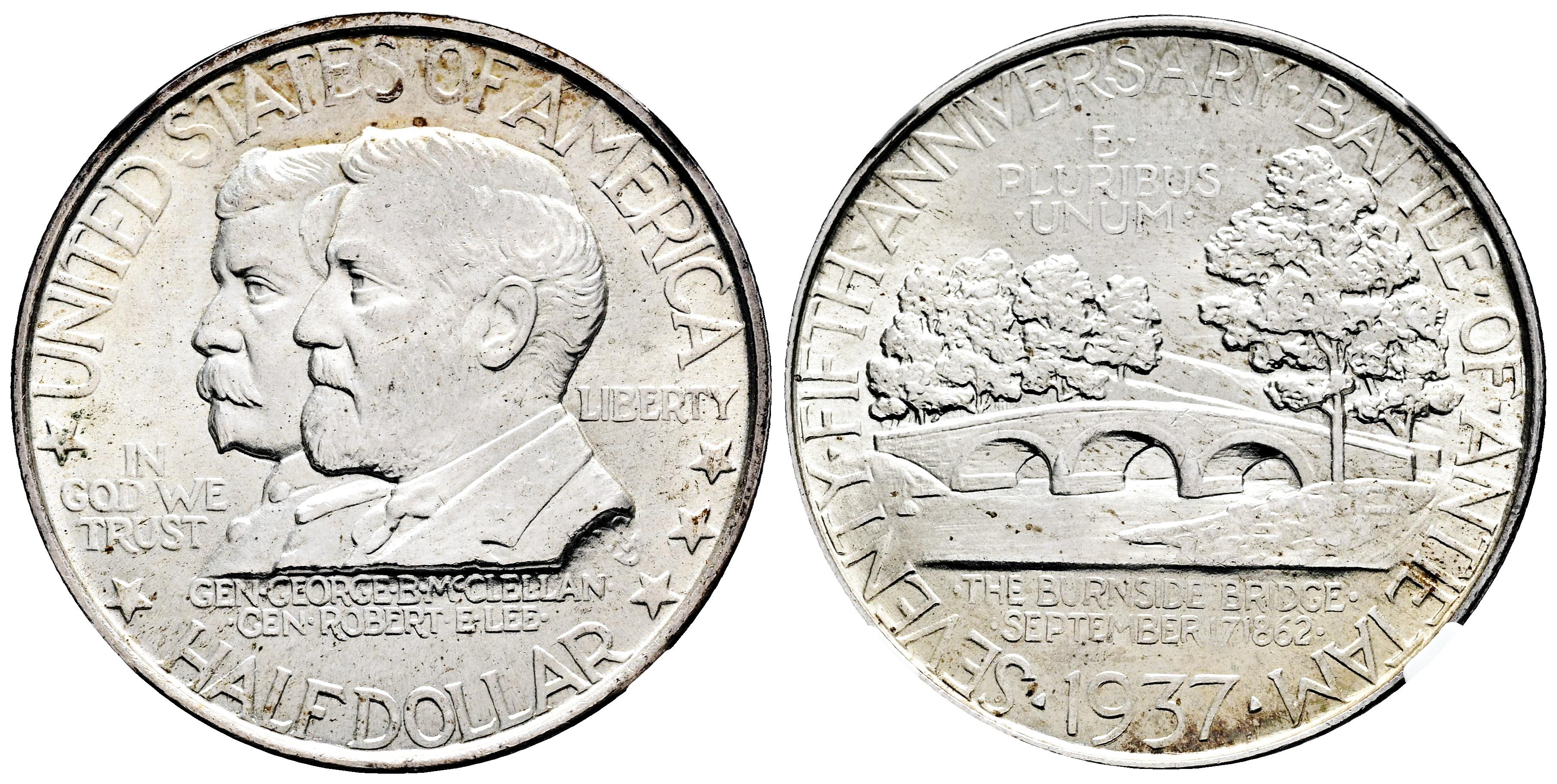 U.S. Coins. Half Dollars. Half dollar. 1937. (Km-190). Ag. Battle of Antietam 75th anniversary. Slabbed by NGC as MS 66+. Est...800,00.