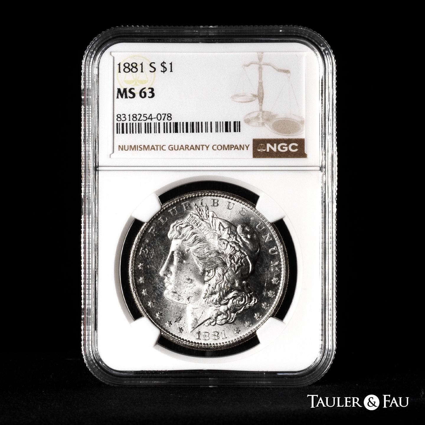 U.S. Coins. Morgan Dollars. 1 dollar. 1881. San Francisco. S. (Km-110). Ag. Slabbed by NGC as MS 63. Plenty of original luster. Est...100,00.