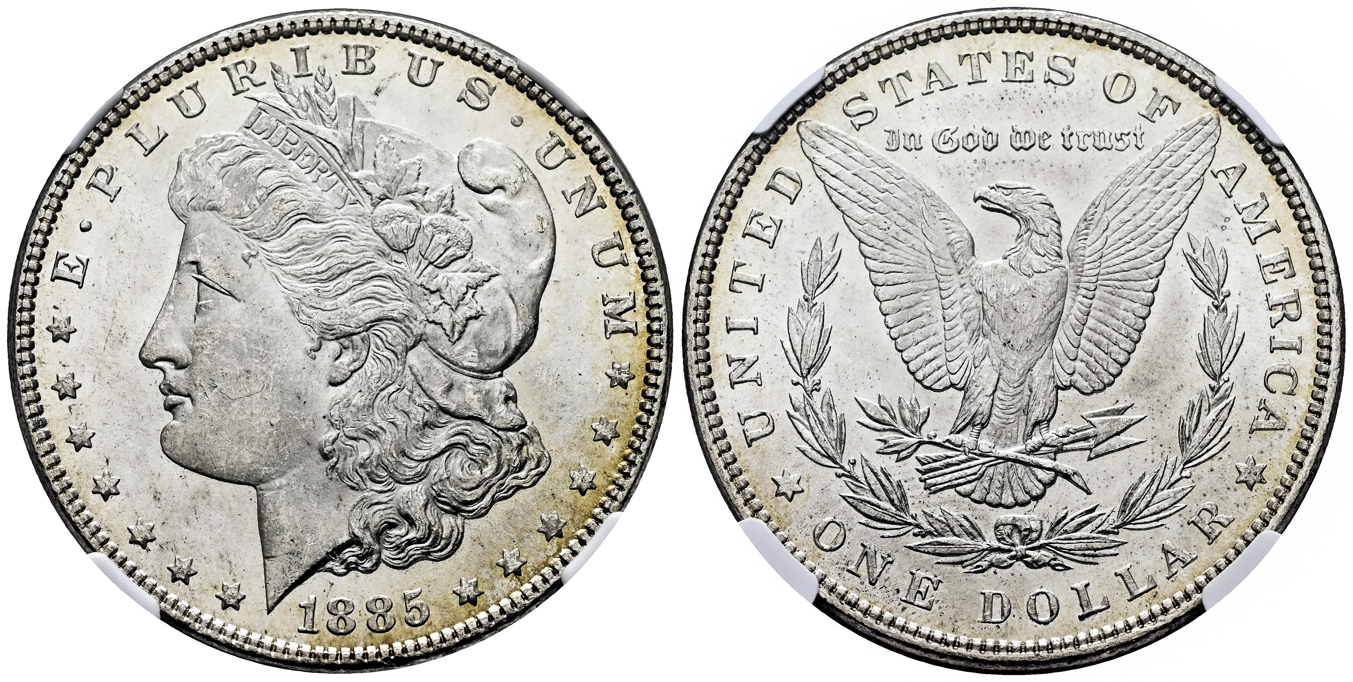 U.S. Coins. Morgan Dollars. 1 dollar. 1885. Philadelphia. (Km-110). Ag. Plenty of original luster. Slabbed by NGC as MS 63. Est...90,00.