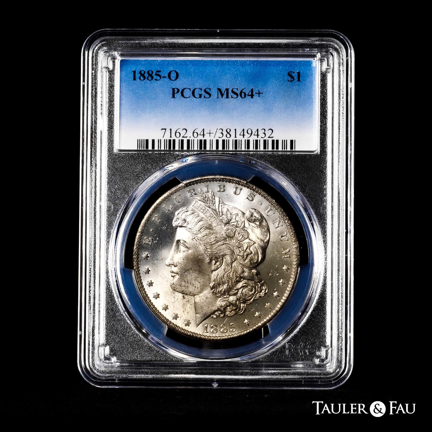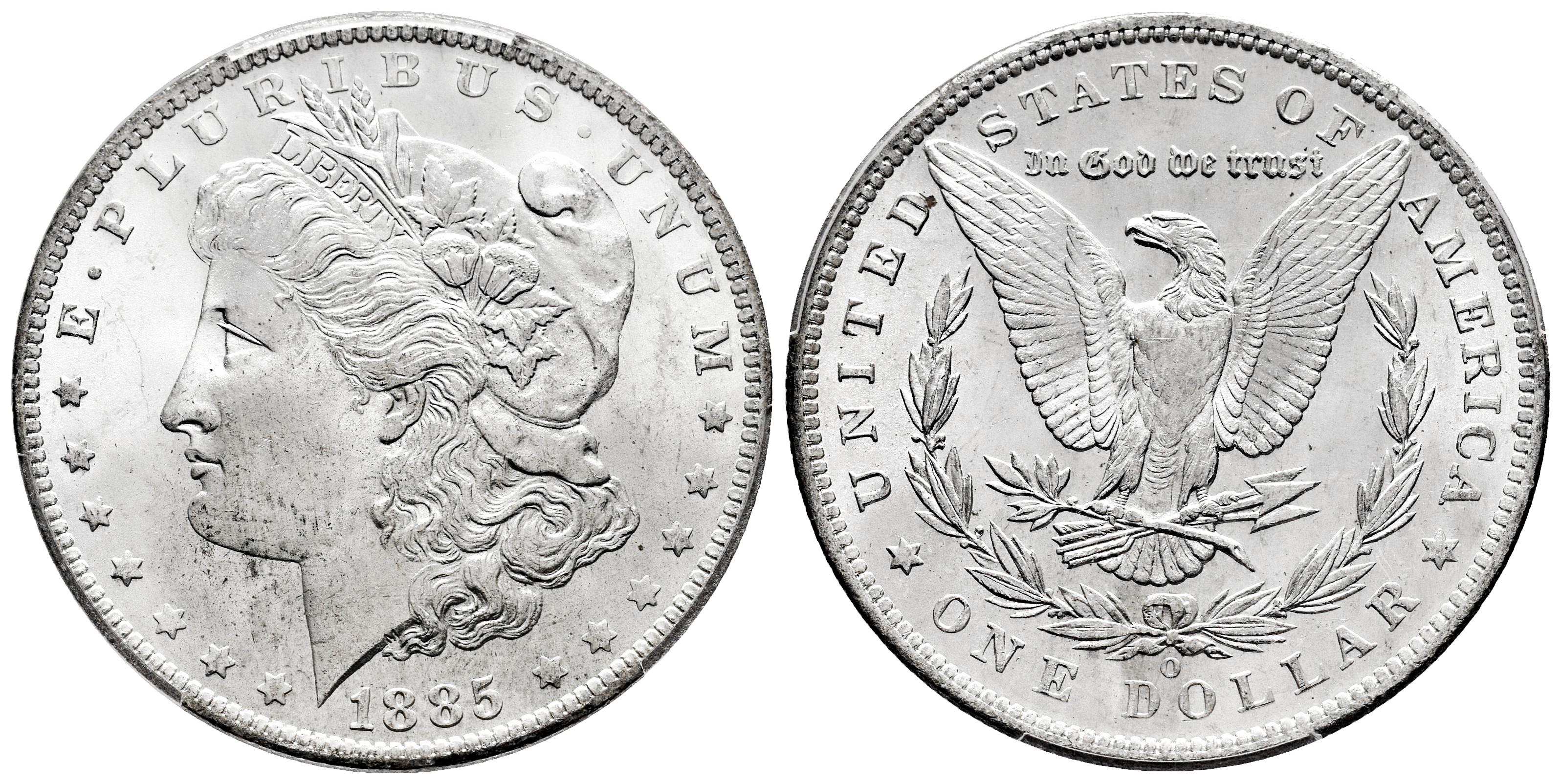 U.S. Coins. Morgan Dollars. 1 dollar. 1885. New Orleans. O. (Km-110). Ag. Plenty of original luster. Slabbed by PCGS as MS 64+. Est...150,00.