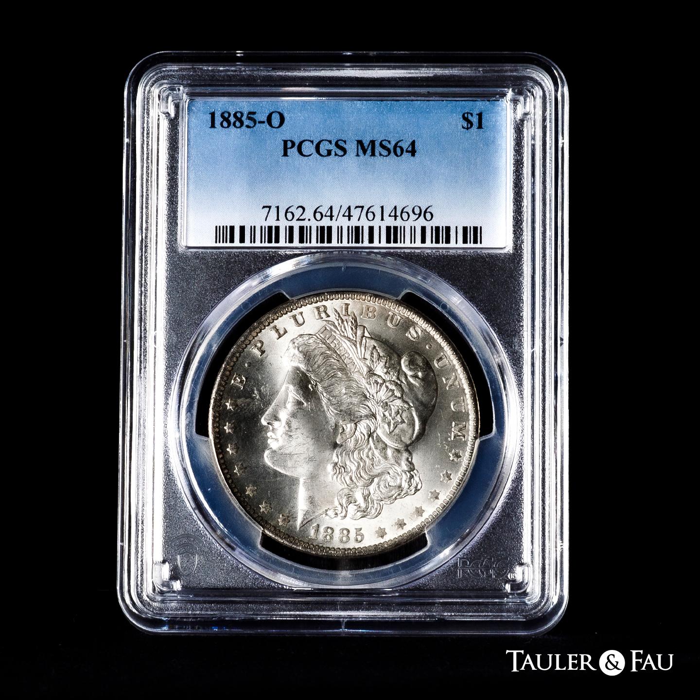 U.S. Coins. Morgan Dollars. 1 dollar. 1885. New Orleans. O. (Km-110). Ag. Slabbed by PCGS as MS 64. Est...120,00.