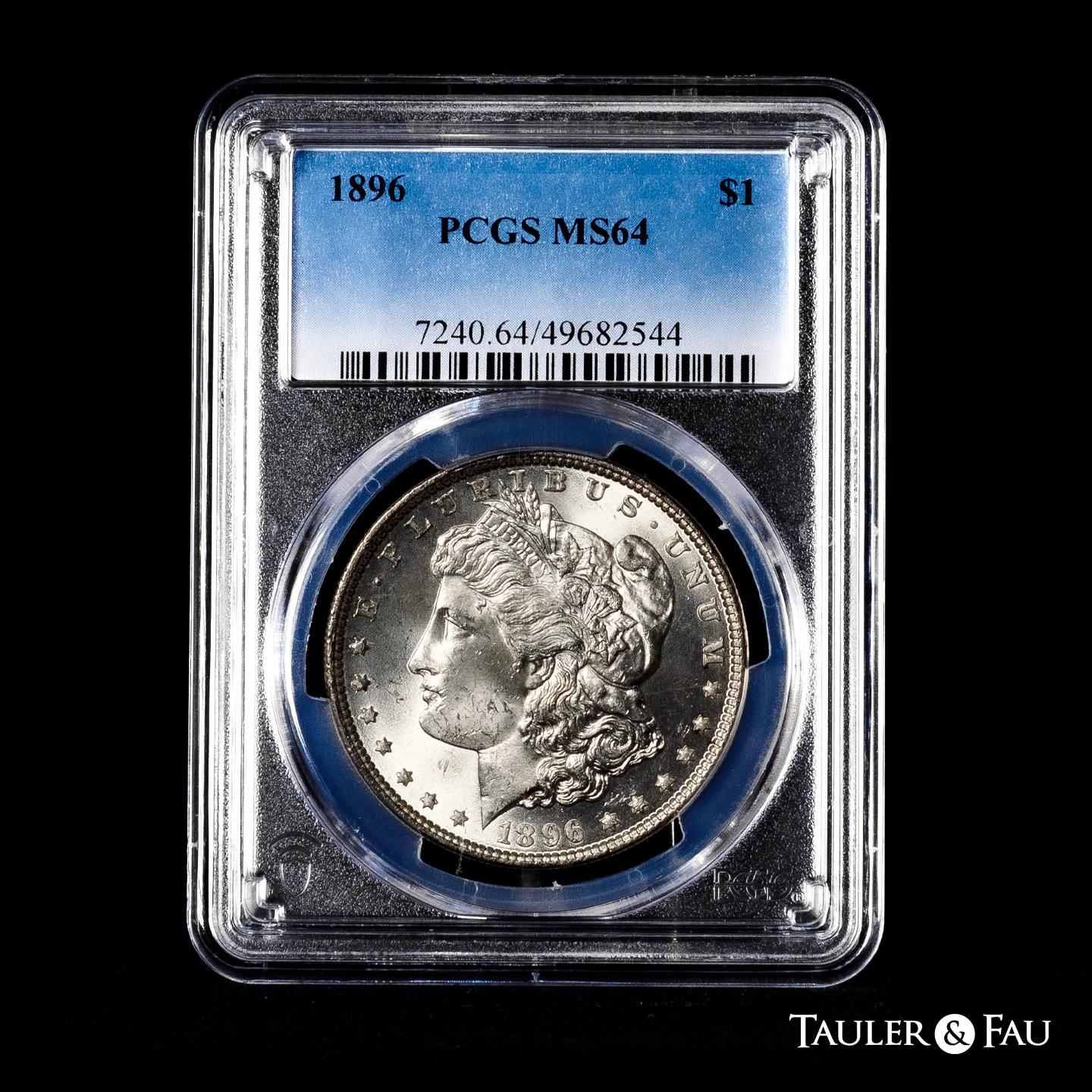 U.S. Coins. Morgan Dollars. 1 dollar. 1896. Philadelphia. (Km-110). Ag. Plenty of original luster. Slabbed by PCGS as MS 64. Est...100,00.