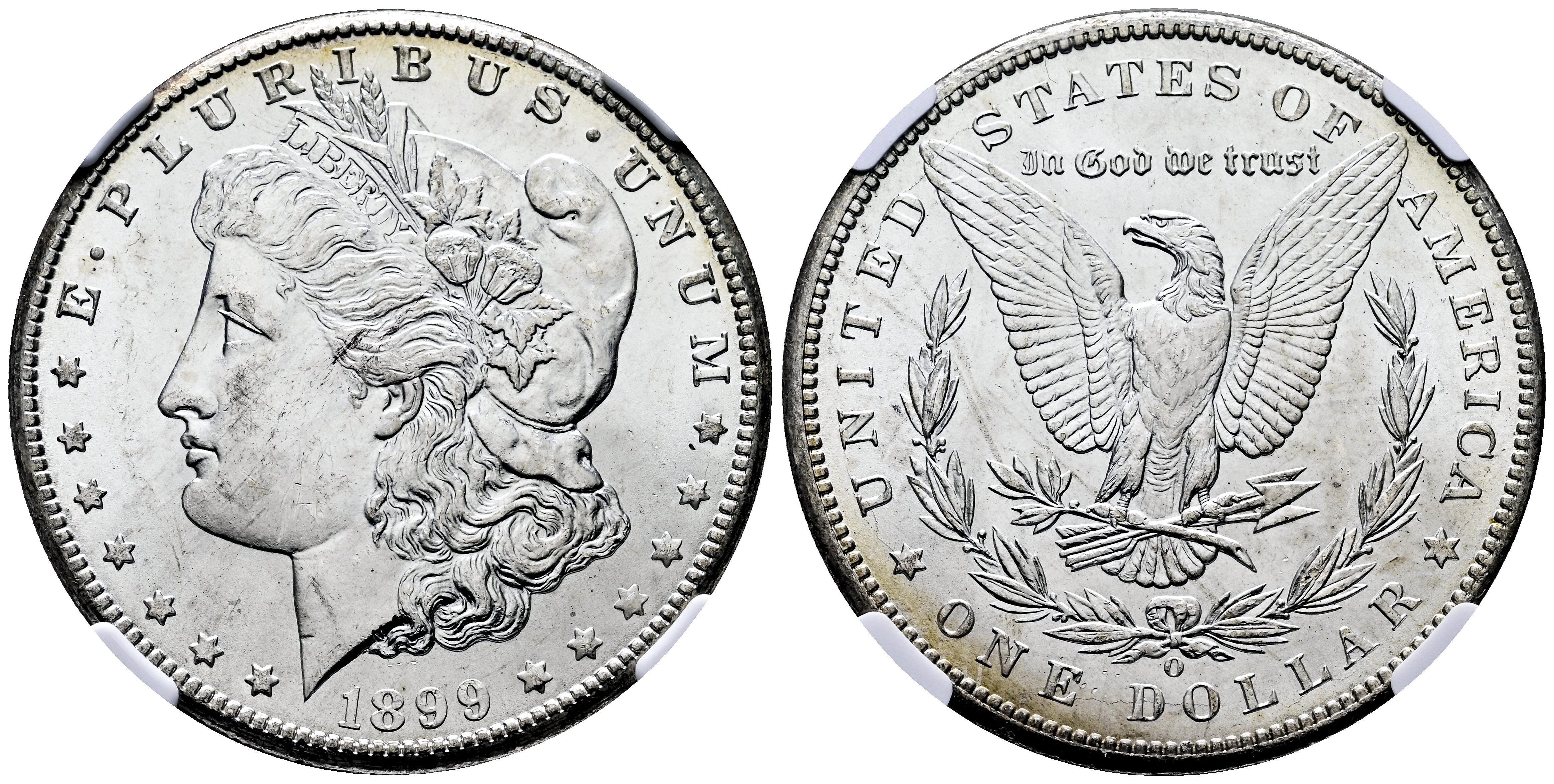 U.S. Coins. Morgan Dollars. 1 dollar. 1899. New Orleans. O. (Km-110). Ag. Minor marks. Plenty of original luster. Slabbed by NGC as MS 63. Est...90,00.