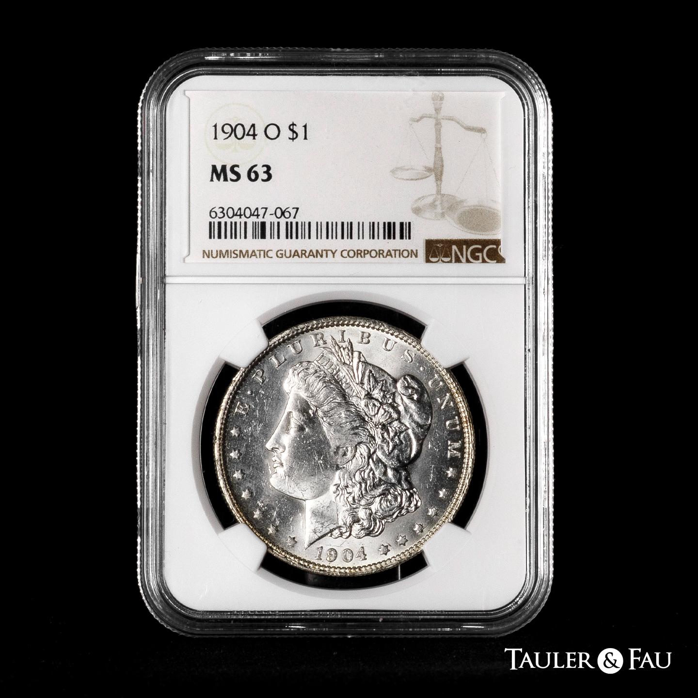 U.S. Coins. Morgan Dollars. 1 dollar. 1904. New Orleans. O. (Km-110). Ag. Original luster. Slabbed by NGC as MS 63. Est...90,00.
