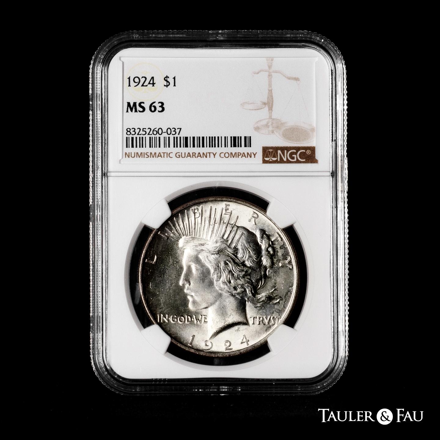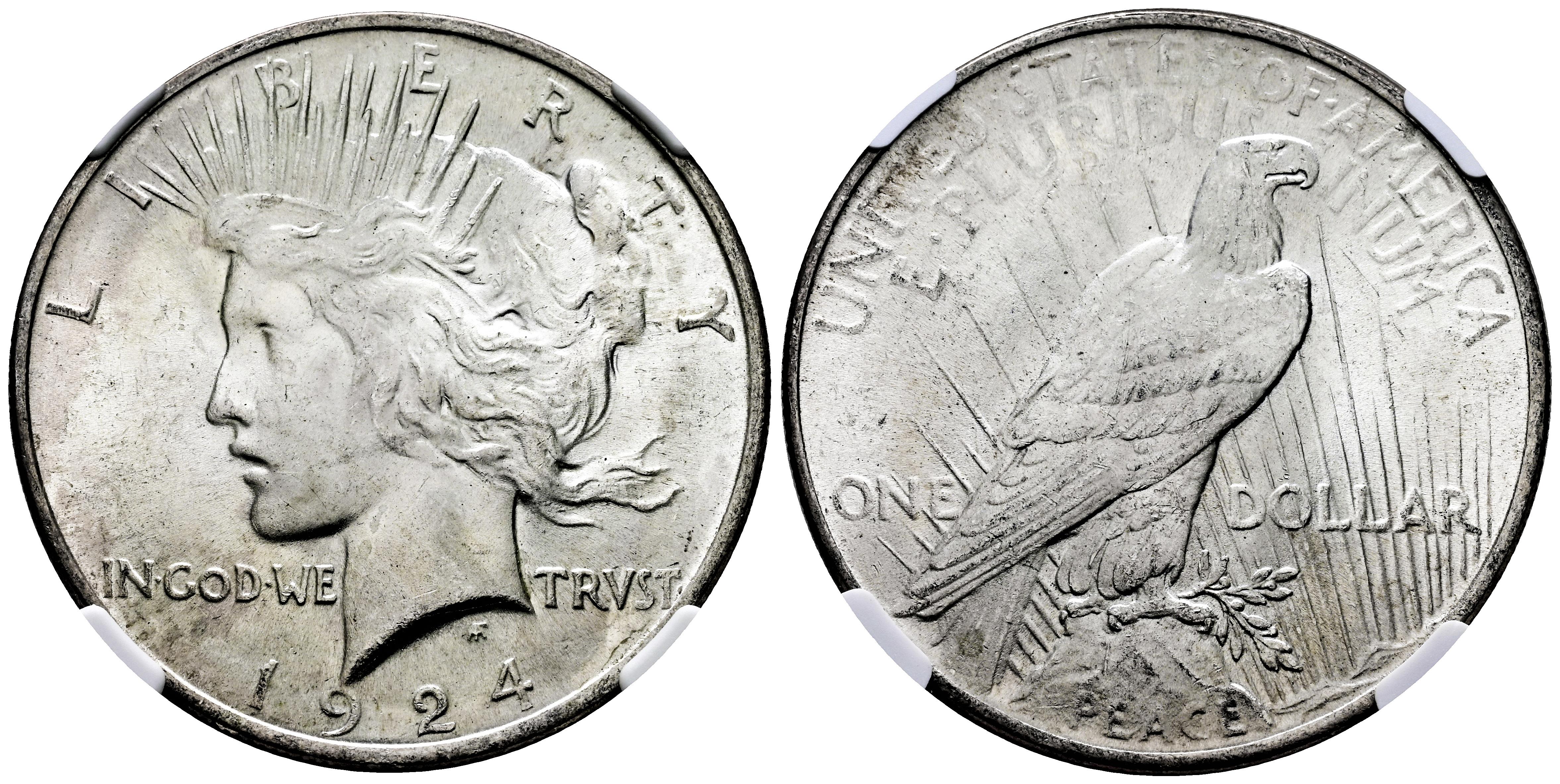 U.S. Coins. Peace Dollar. 1 dollar. 1924. Philadelphia. (Km-150). Ag. Original luster. Slabbed by NGC as MS 63. Est...90,00.