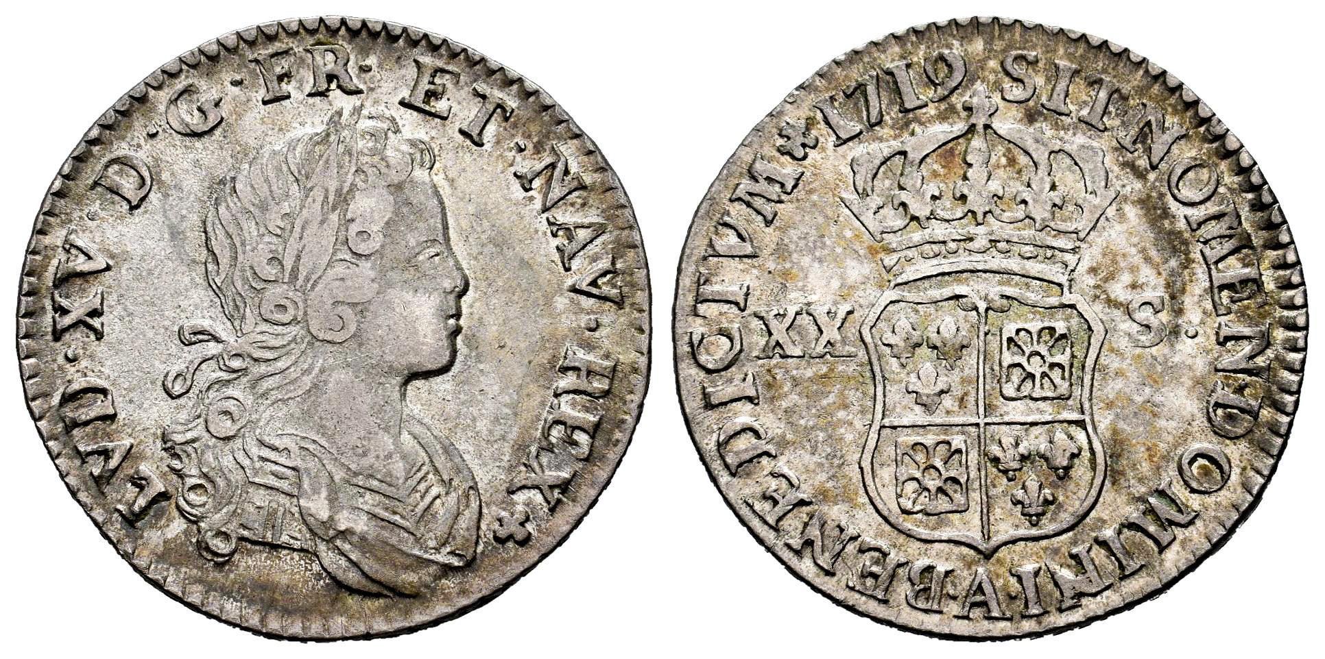France. Louis XV (1715-1774). 20 soles. 1719. Paris. A. (Km-440.1). (Duplessy-1661). (Gad-295). Ag. 4,06 g. Armas de Navarra. Choice VF. Est...70,00.