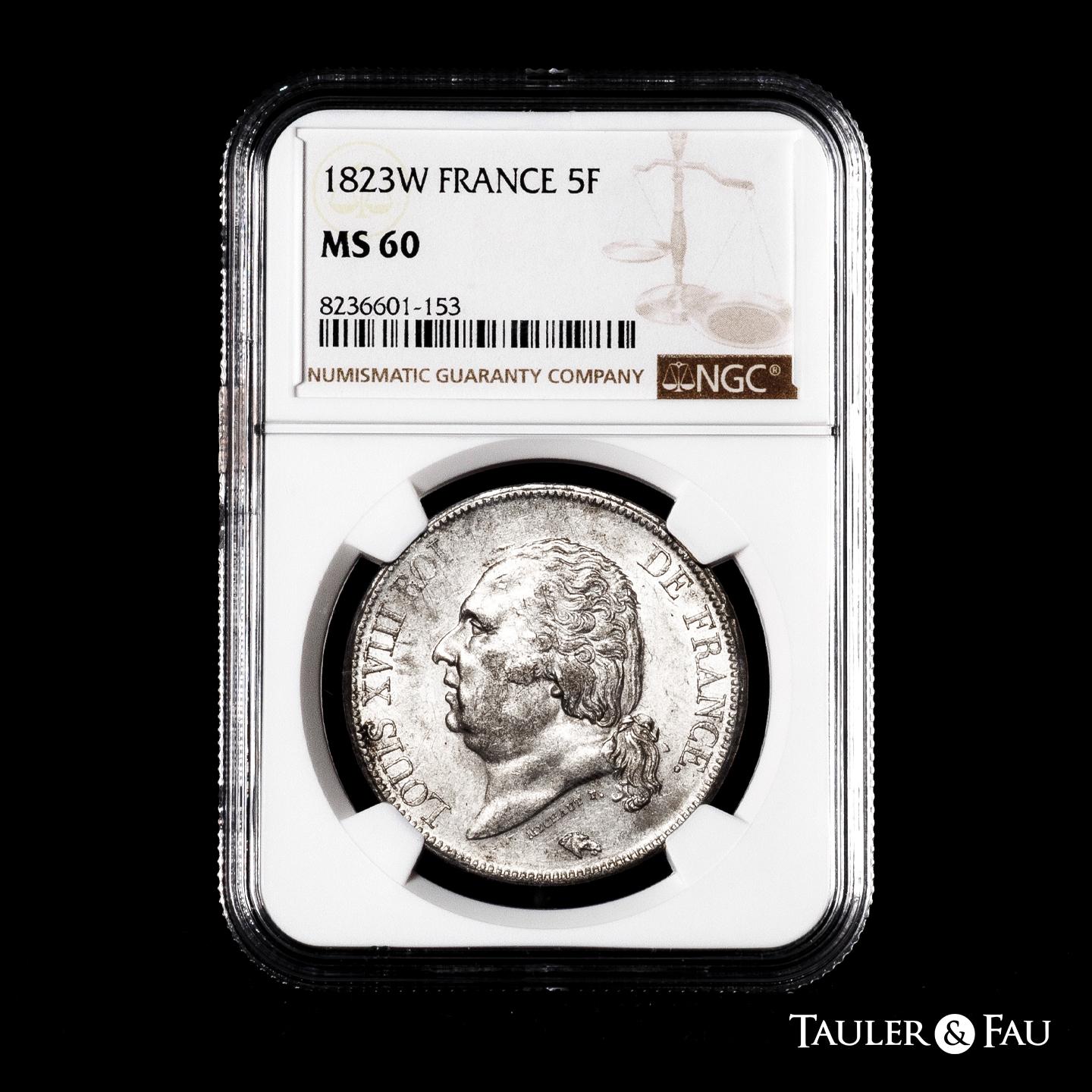 France. Louis XVIII (1814-1824). 5 francs. 1823. Lille. W. (Km-711.13). (Gad-614). Ag. Original luster. Slabbed by NGC as MS 60. Est...200,00.