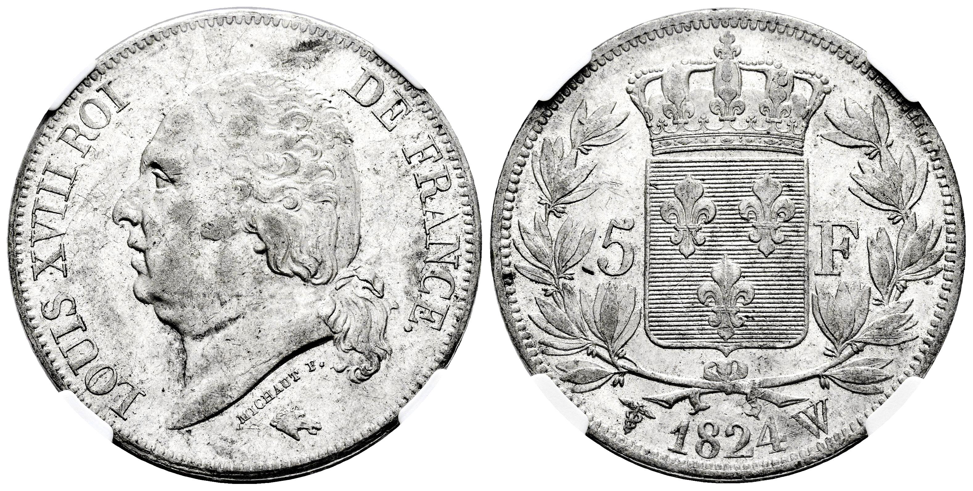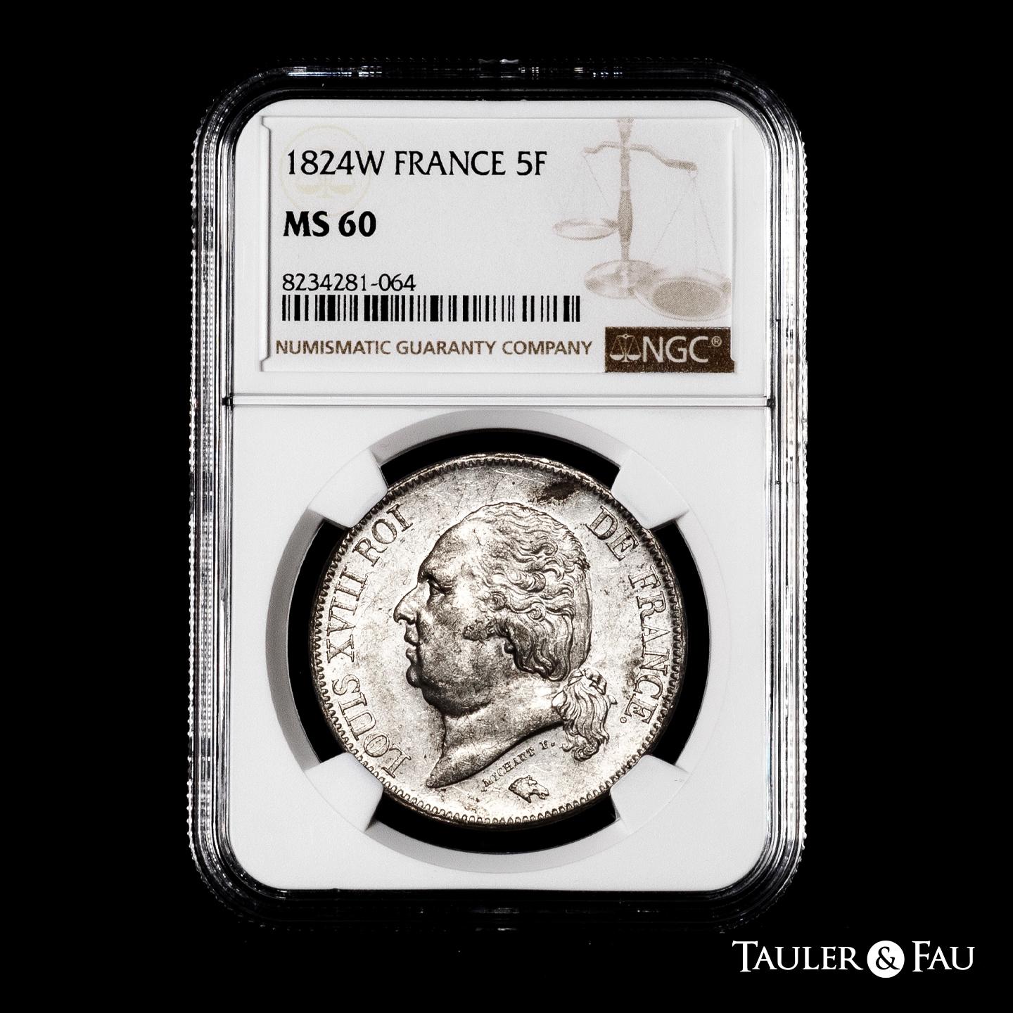 France. Louis XVIII (1814-1824). 5 francs. 1824. Lille. W. (Km-711.13). (Gad-614). Ag. Original luster. Slabbed by NGC as MS 60. Est...250,00.