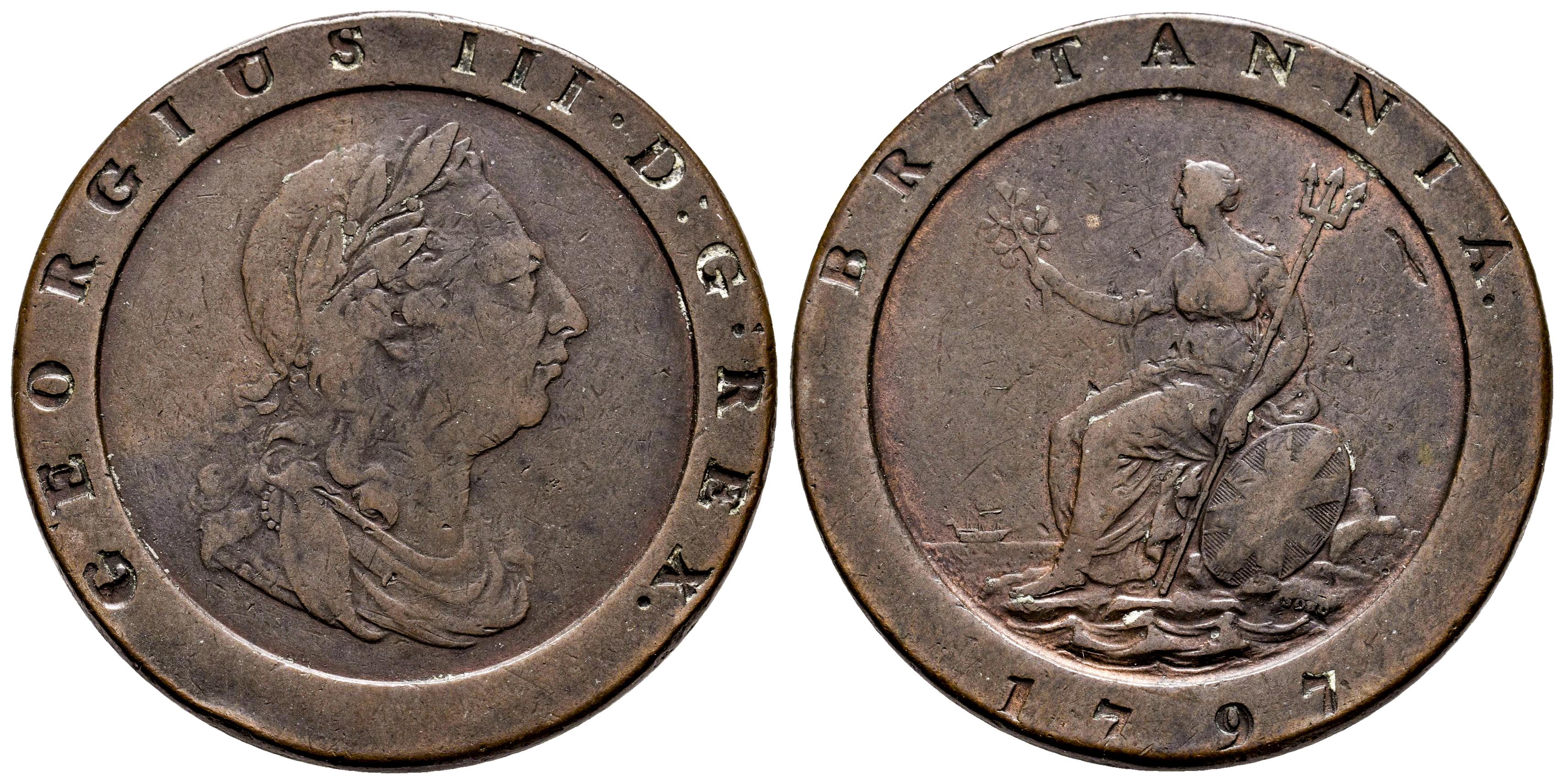 Great Britain. George III. 2 pence. 1797. (Km-619). Ae. 57,10 g. Minor nicks. VF. Est...70,00.