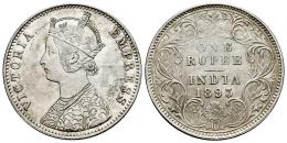 British India. Victoria. 1 rupee. 1883. Calcuta. (Km-492). Ag. 11,63 g. Type A bust, Tupe II reverse. Incuse C. Hairlines. Cleaned. XF. Est...30,00.