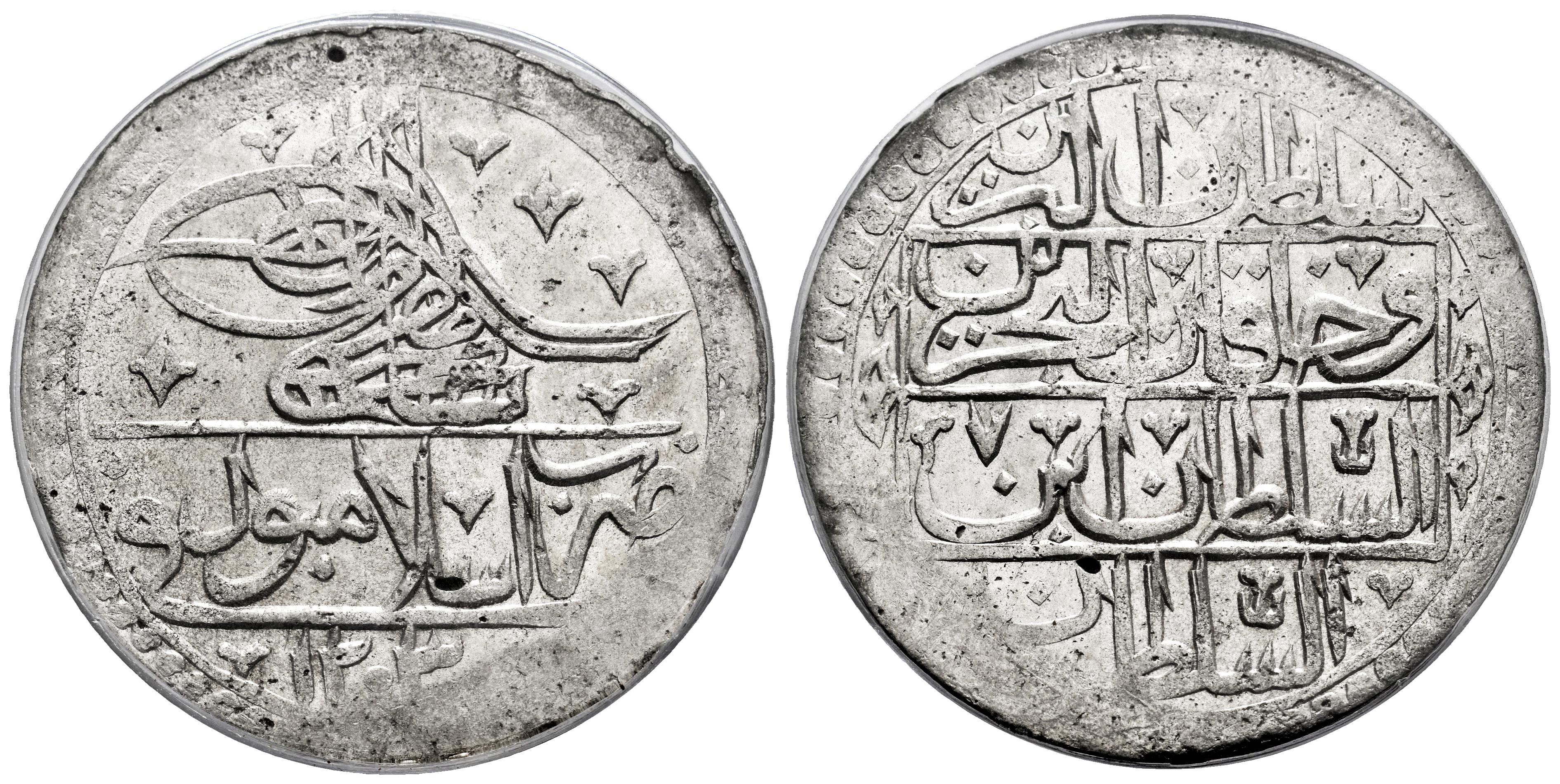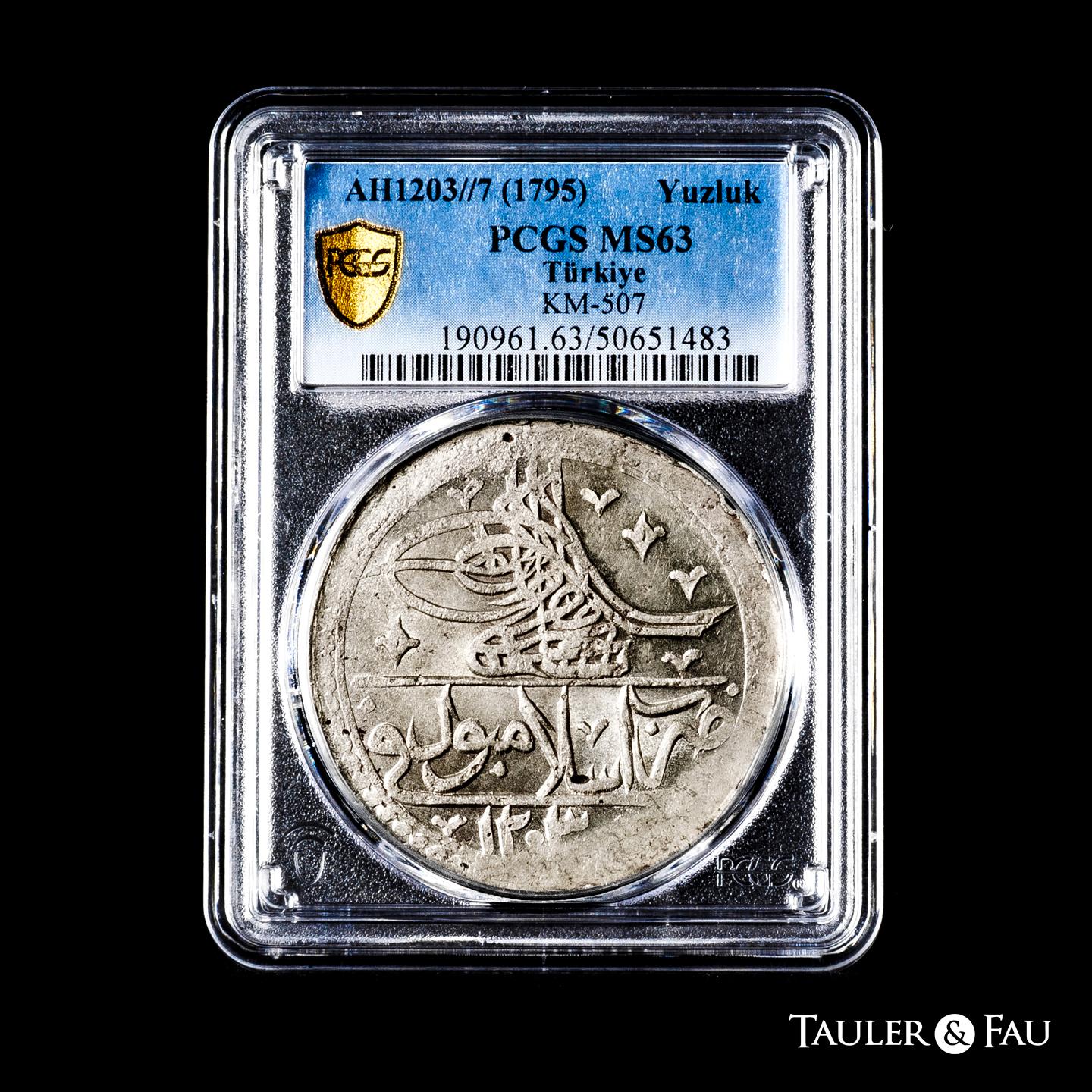 Ottoman Empire. Selim III (1789-1807). 1 yuzluk. 1203/7 H (1795). (Km-507). Ag. Original luster. Slabbed by PCGS as MS 63. (Top Pop), the finest known in the PCGS census. Est...300,00.