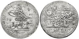 Ottoman Empire. Selim III (1789-1807). 1 yuzluk. 1203/10 (1798). (Km-507). Ag. 32,24 g. Planchet defect on edge. Traces of luster. XF. Est...90,00.