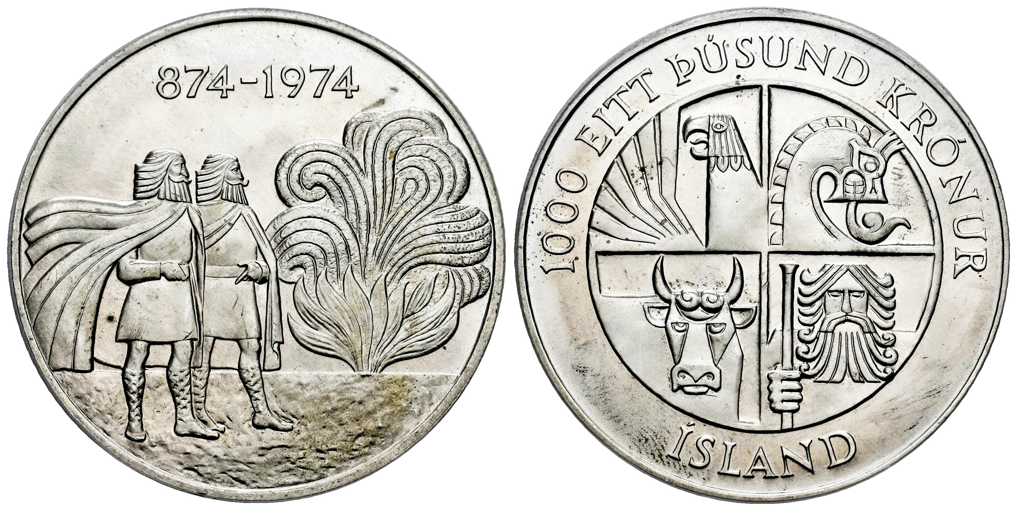 Iceland. 1000 Kronur. 1974. (Km-21). Ag. 1100th Anniversary of the First Settlement. Slabbed by PCGS as MS 67. Est...60,00.