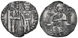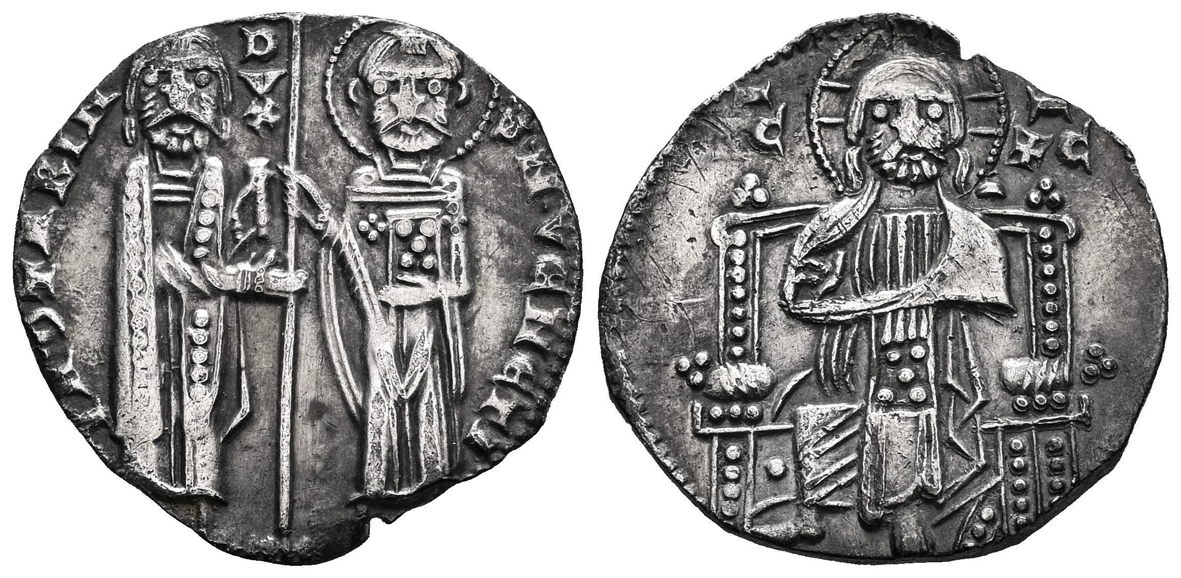 Italy. Venice. Iacopo Contarini (1275-1280). Grosso. 1280-1289 AD. Doge XLVII. (Paolucci-1). Anv.: IA•9TARIN S•M•VENETI, Doge and St Mark standing facing, holding banner between them; DVX downwards to left of staff. Rev.: Christ enthroned facing, raising hand in benediction and holding Gospels; quatrefoils on throne back, barred IC-XC across upper fields. Ag. 1,89 g. Delicate patina. Choice VF. Est...60,00.