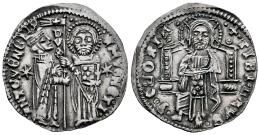 Italy. Venice. Antonio Venier (1382-1400). Grosso. Doge LXII. (Paolucci-3). (Papadopoli-3). Anv.: ANTO • VENERIO DVX S M VENETI, Doge and St Mark standing facing, holding banner between them; star in left and right fields. Rev.: ✠ • TIBI • LAVS • 7 • GLORIA •, Christ Pantokrator enthroned facing. Ag. 1,80 g. Ex Classical Numismatic Group 437 (06/02/2019), lot 586. XF. Est...120,00.