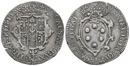 Italy. Cesare d'Este with his wife Virginia De' Medici. 6 Bolognini. 1598-1615. Módena. Duchy of Modena and Reggio. (MIR-711/1). (Cni-10). Anv.: : CAESAR : DVX : MVTINAE : REG · C · . Crowned coat of arms. Rev.: : VIRGINIA : DVCISSA : MVTINAE. Medici coat of arms crownedoronado. Ag. 2,92 g. Rare. Choice VF. Est...200,00.
