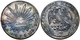 Mexico. 8 reales. 1892. Hermosillo. FG. (Km-377.9). Ag. 27,27 g. Nice patina with iridescent tones. Original luster. Attractive. Minimal hairlines. Mint state. Est...180,00.