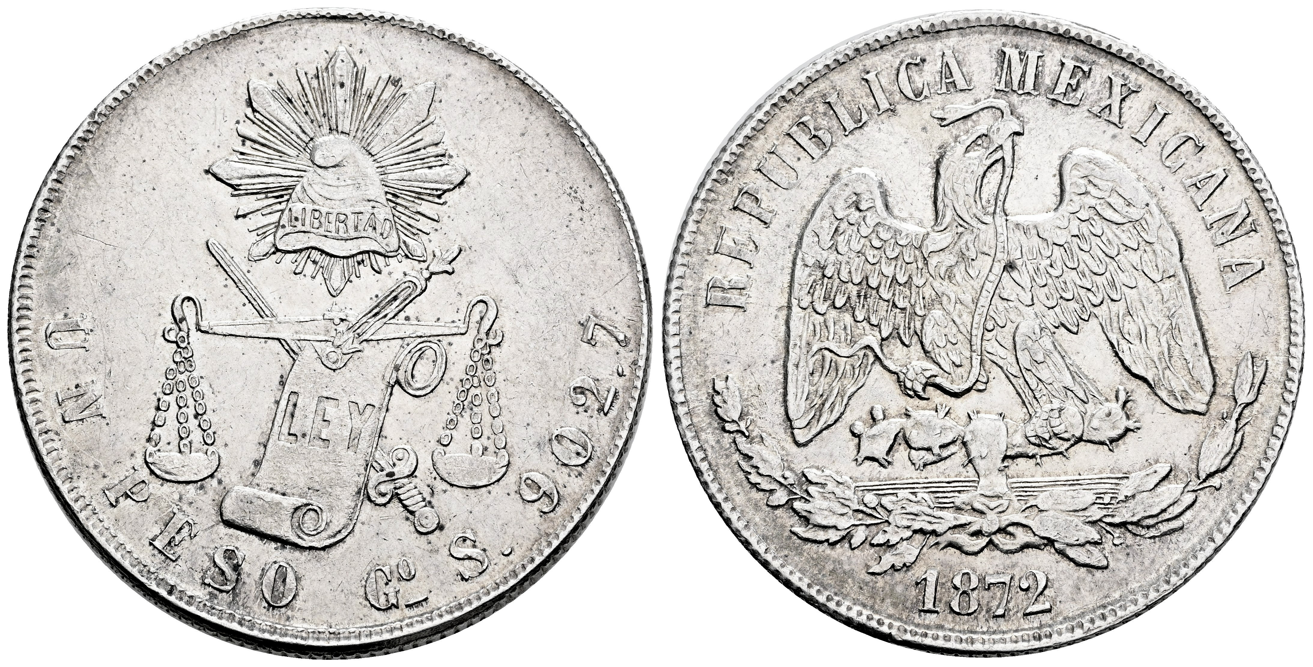 Mexico. 1 peso. 1872. Guanajuato. S. (Km-408.4). Ag. 27,16 g. Traces of luster. XF. Est...250,00.
