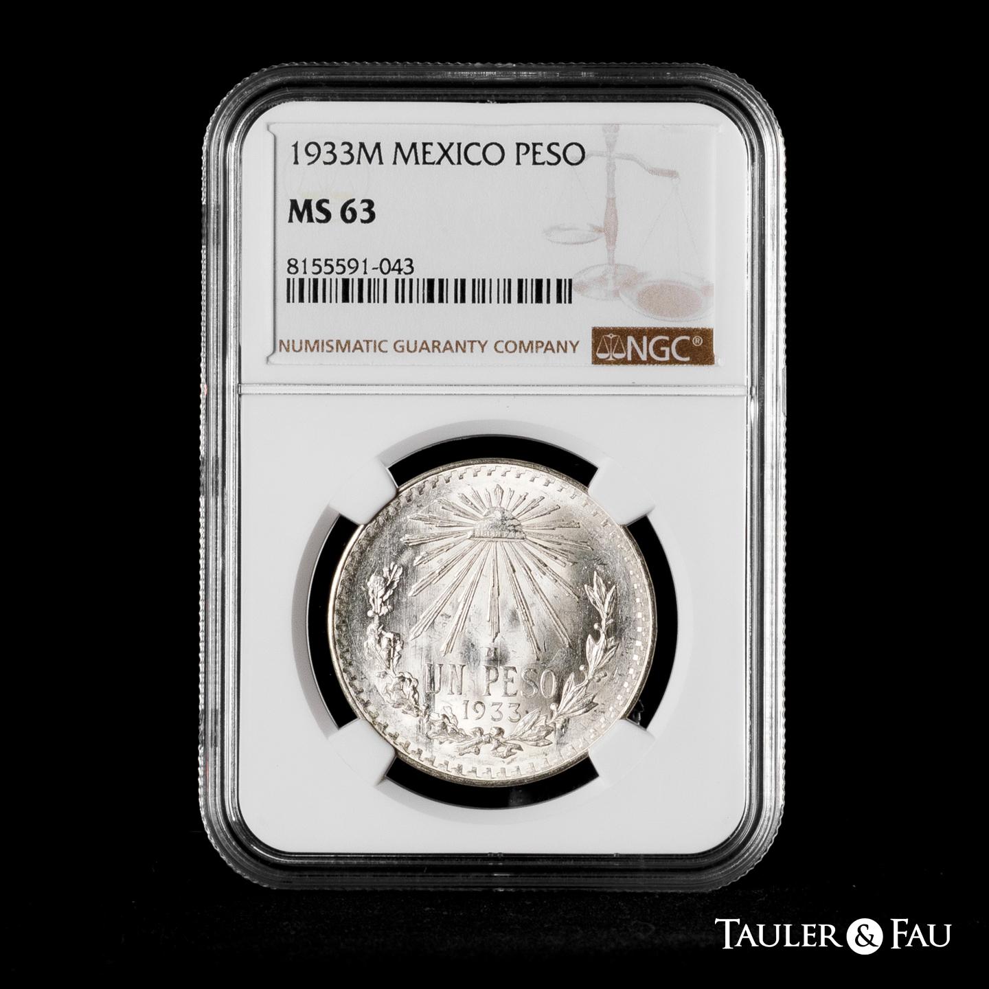 Mexico. 1 peso. 1933. Mexico. M. (Km-455). Ag. 16,71 g. Slabbed by NGC as MS 63. Est...60,00.